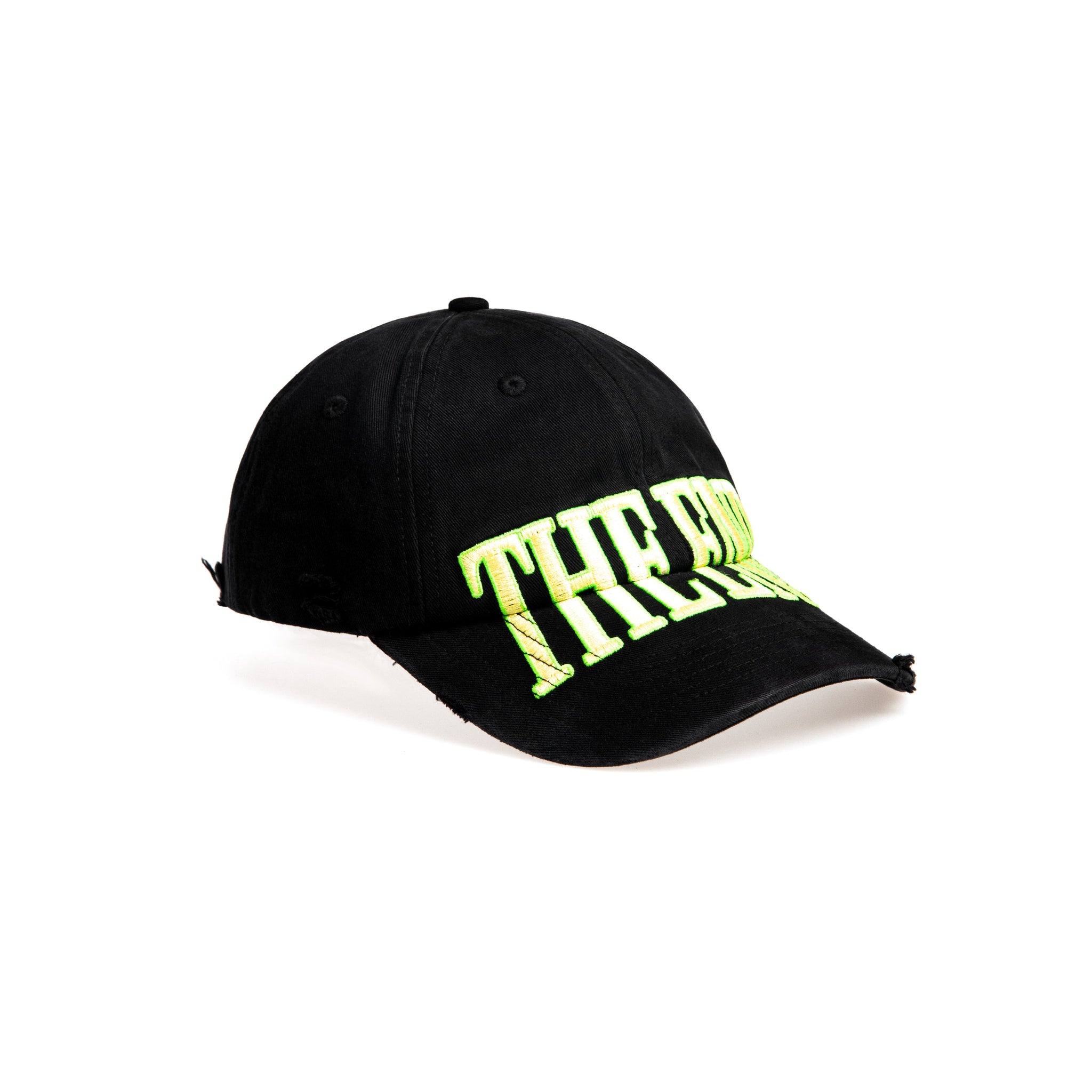A dystopian-inspired essential from our Fall/Winter 2024 collection, this unisex six-panel cap fuses futuristic grit with bold streetwear aesthetics. Featuring a striking cross-panel ‘THE END’ embroidered graphic in yellow with a green outline, the design creates a vivid 3D illusion. Distressed frayed edges and tonal stitched eyelets add a worn-in edge, nodding to the mood of a near-future world undone.