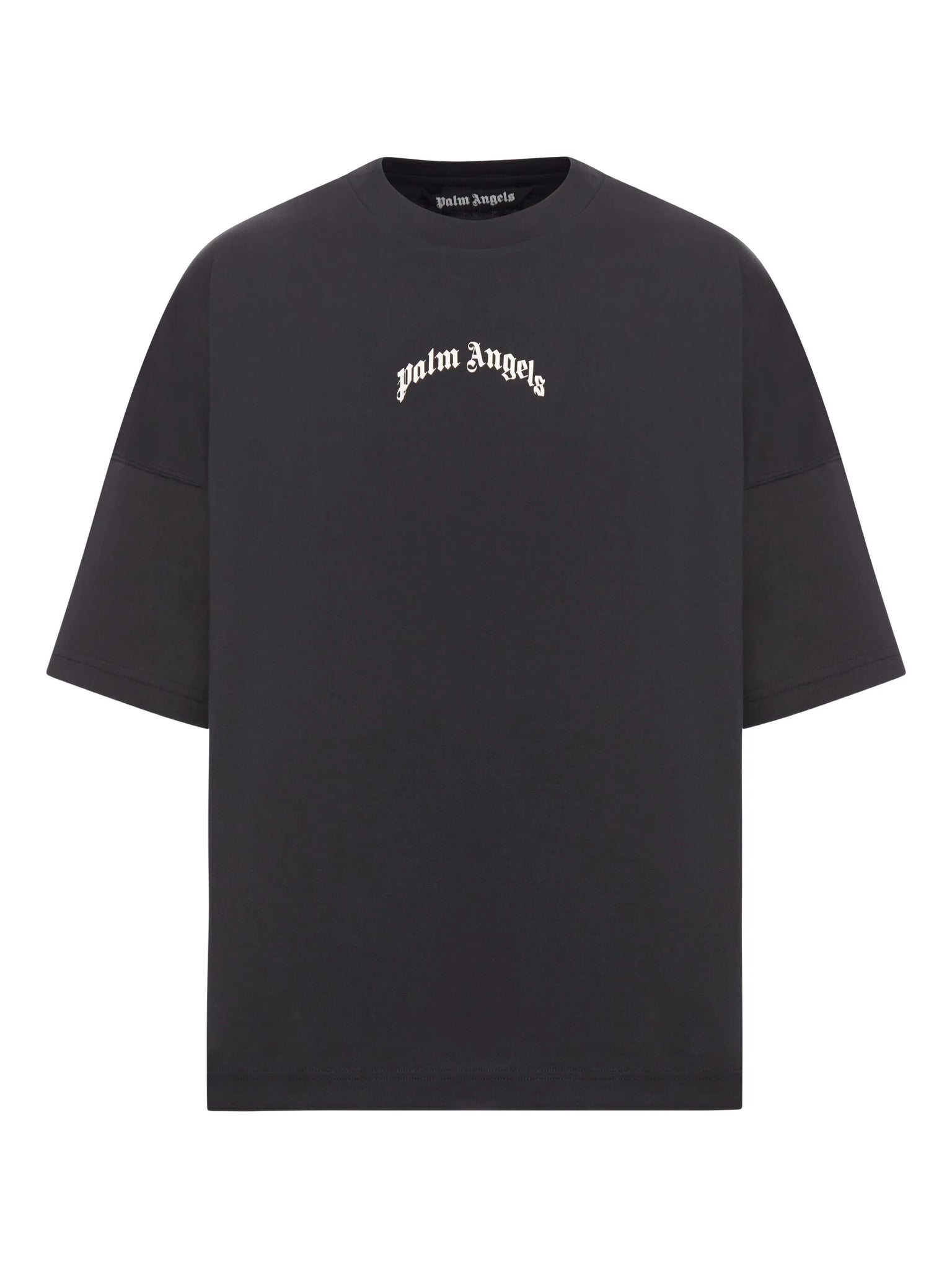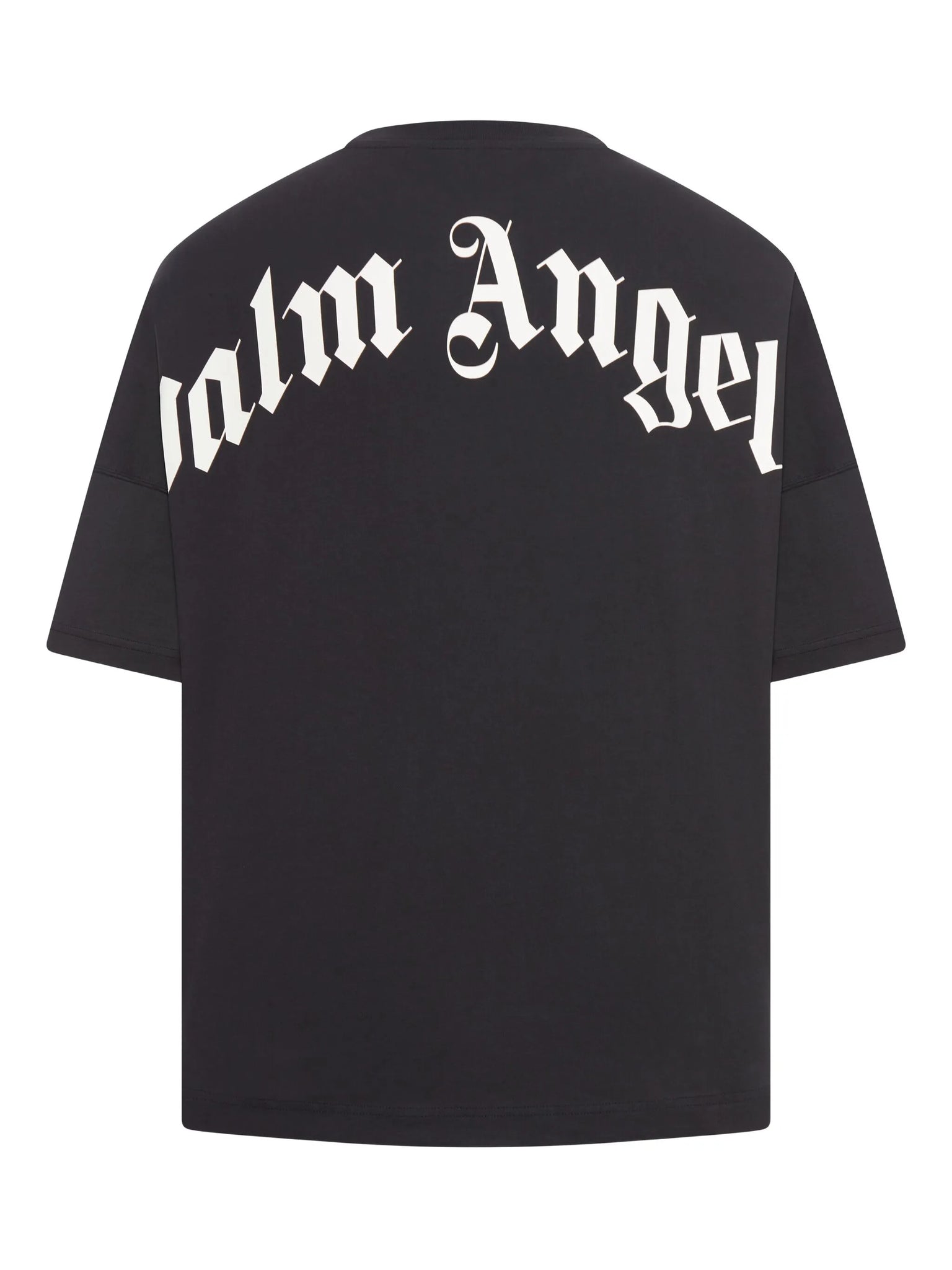 Streetwear made iconic—this oversized Palm Angels tee showcases the brand’s signature curved logo in off-white across the back. A clean front and bold back detail make it a wardrobe essential.