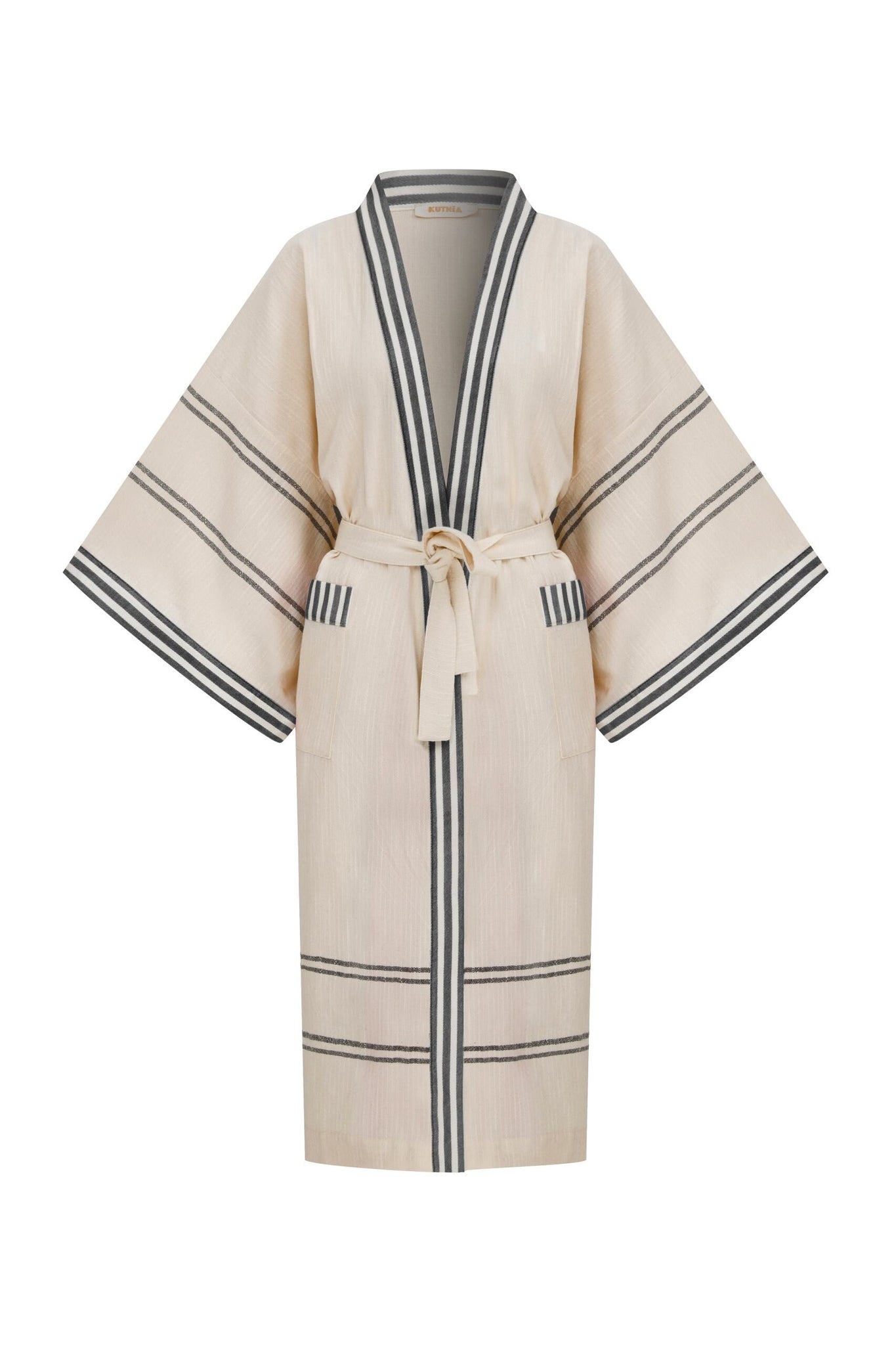 Elegant and timeless, the Peshtemal Cotton Kimono with Kutnu Trim from Kutnia redefines heritage craftsmanship through a modern lens. Crafted from fluid black peshtemal cotton and elevated with traditional Kutnu trim, this kimono offers a graceful silhouette with refined cultural detail. Designed for sophisticated homewear and elevated lounging in Saudi Arabia, it blends artisanal textile heritage with contemporary luxury.