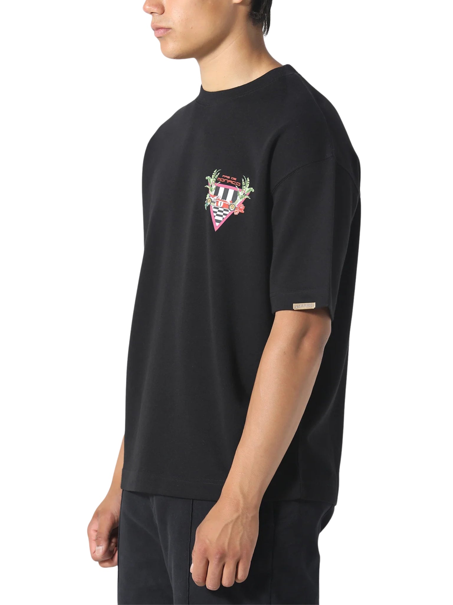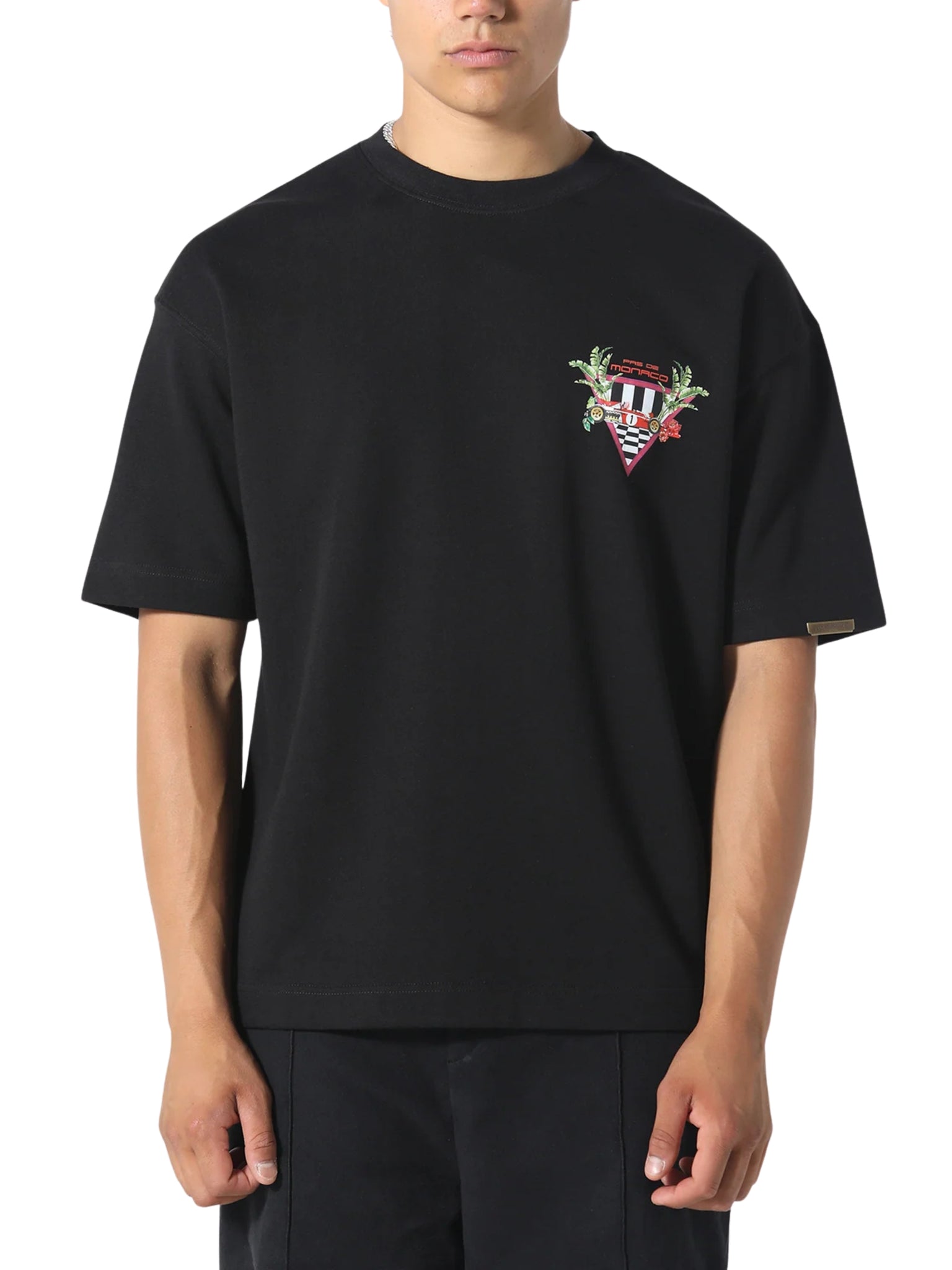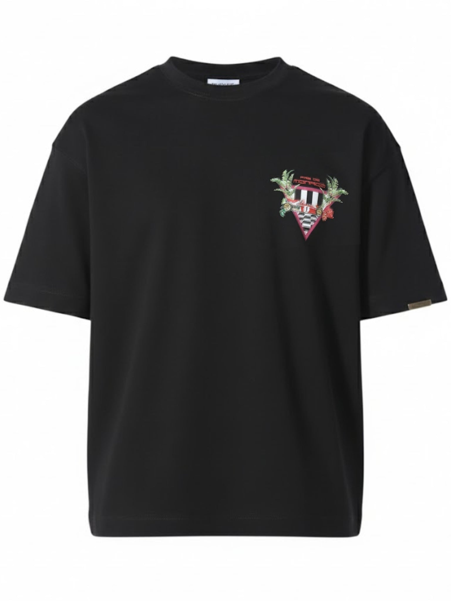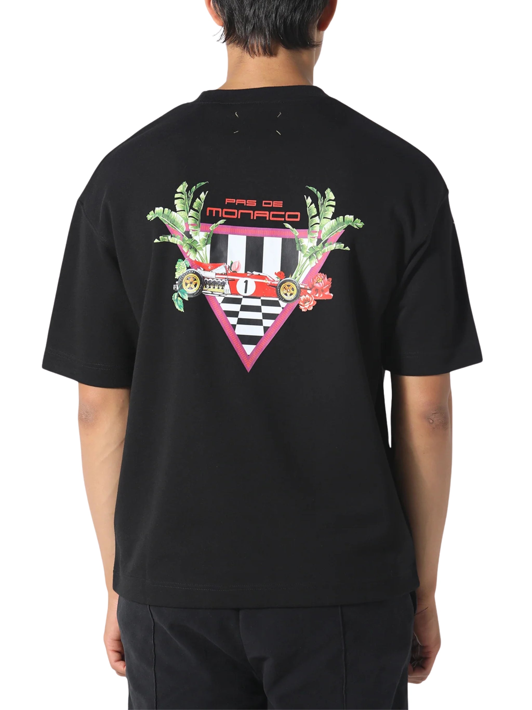 Bold front and back screen-printed graphics featuring a classic formula car with tropical flora and checkered motifs
