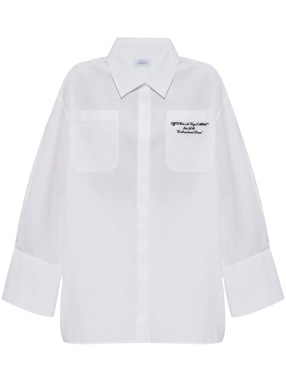 Refined and effortlessly versatile, the Off-White Embroidered Logo Shirt Dress is crafted in Italy from crisp white cotton. This long-sleeved design features a concealed front button fastening, chest patch pockets, and subtle logo embroidery for a modern, polished finish.