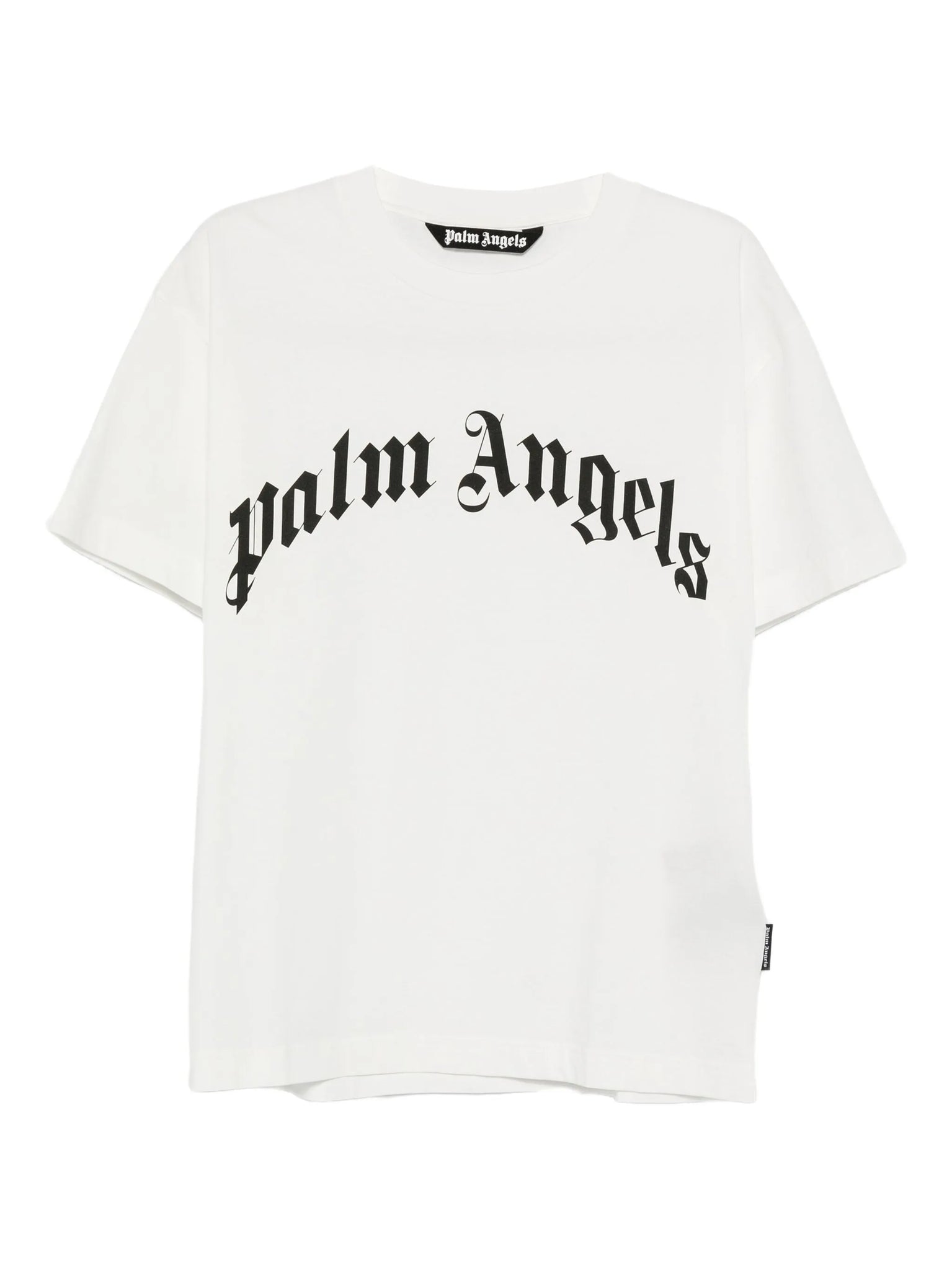 A clean essential with bold character—this Palm Angels tee features the iconic curved logo across the neckline, blending minimal design with signature streetwear flair.