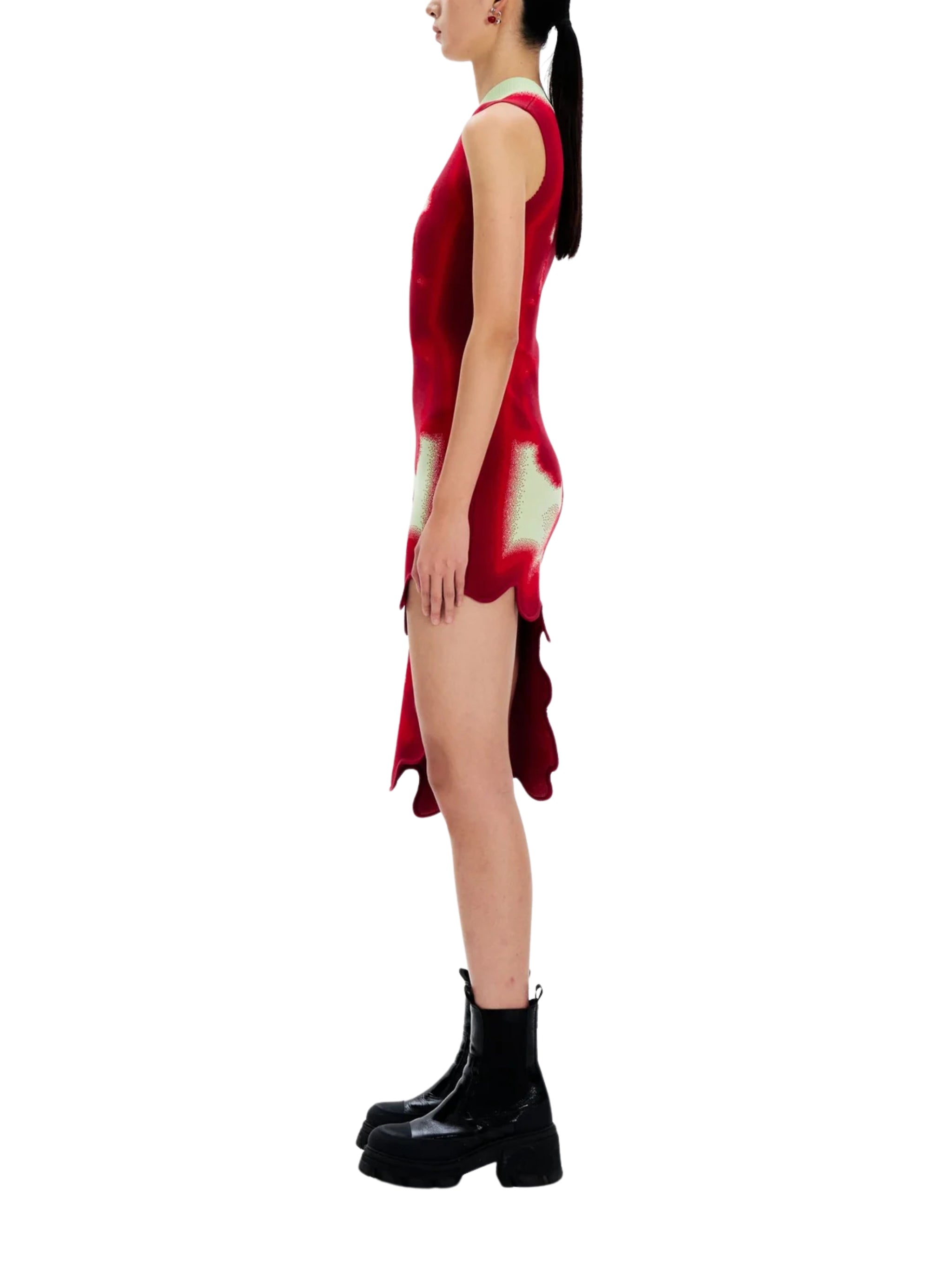 Stand out sustainably. The Brooklyn Tie-Dye Wavy Dress in Cherry Red is a vibrant, sculptural piece blending playful edge with eco-conscious craftsmanship.