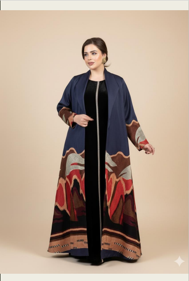 A refined celebration of color and craftsmanship, this navy abaya by MAJESTIC blends rich embroidery with luxurious layering. Designed for elegant occasions in Saudi Arabia, it features vibrant embroidered patterns complemented by a velvet inner dress, creating a graceful and sophisticated statement.