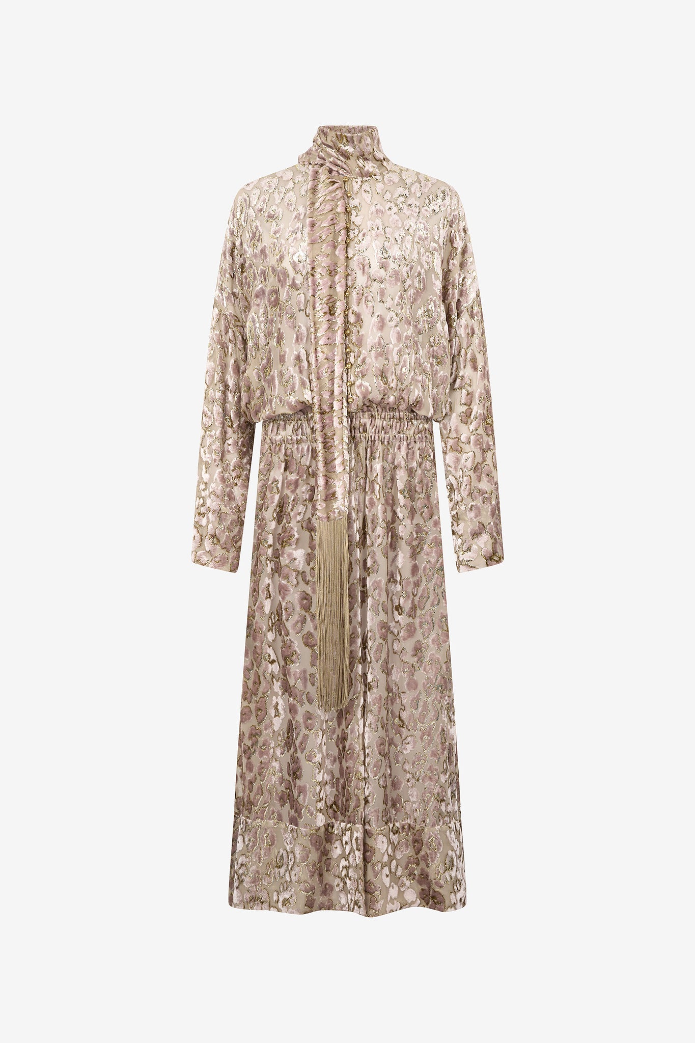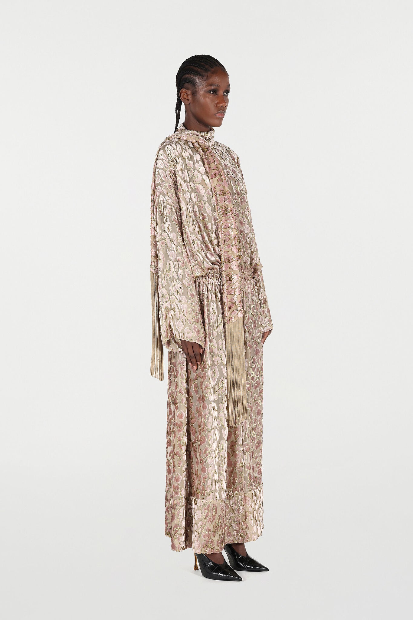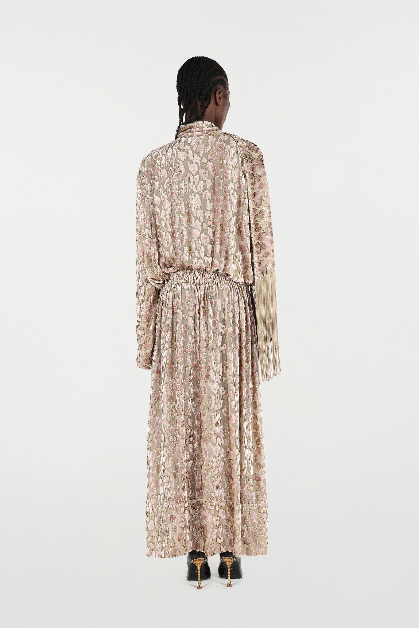 Unveil your refined taste with this full-length Roberto Cavalli dress, crafted in an exquisite blend of silk and viscose. The all-over dappled pattern in soft rosa oro (pink-gold) adds a touch of artistic glamour, ideal for evening events and upscale occasions in the Kingdom.