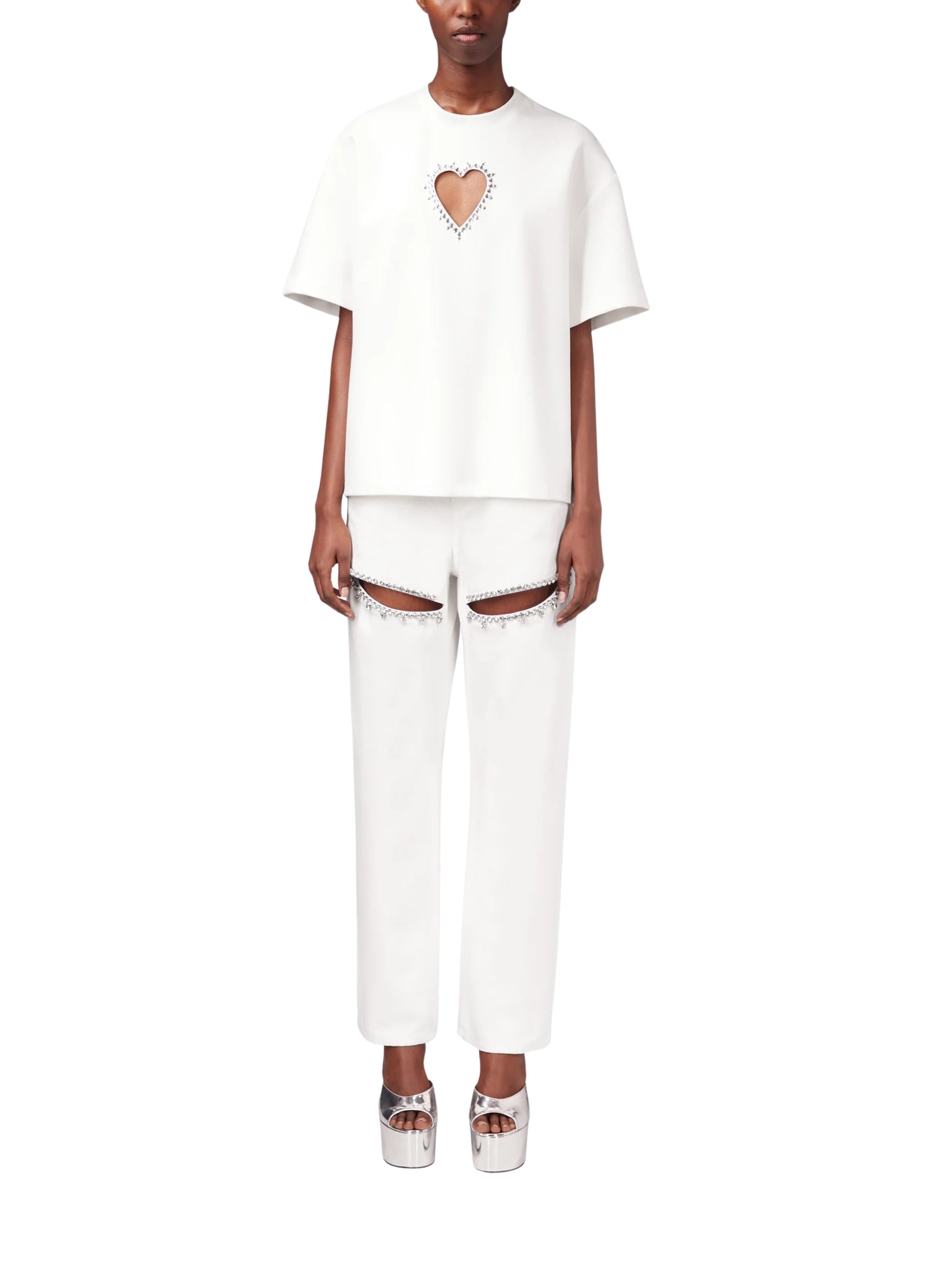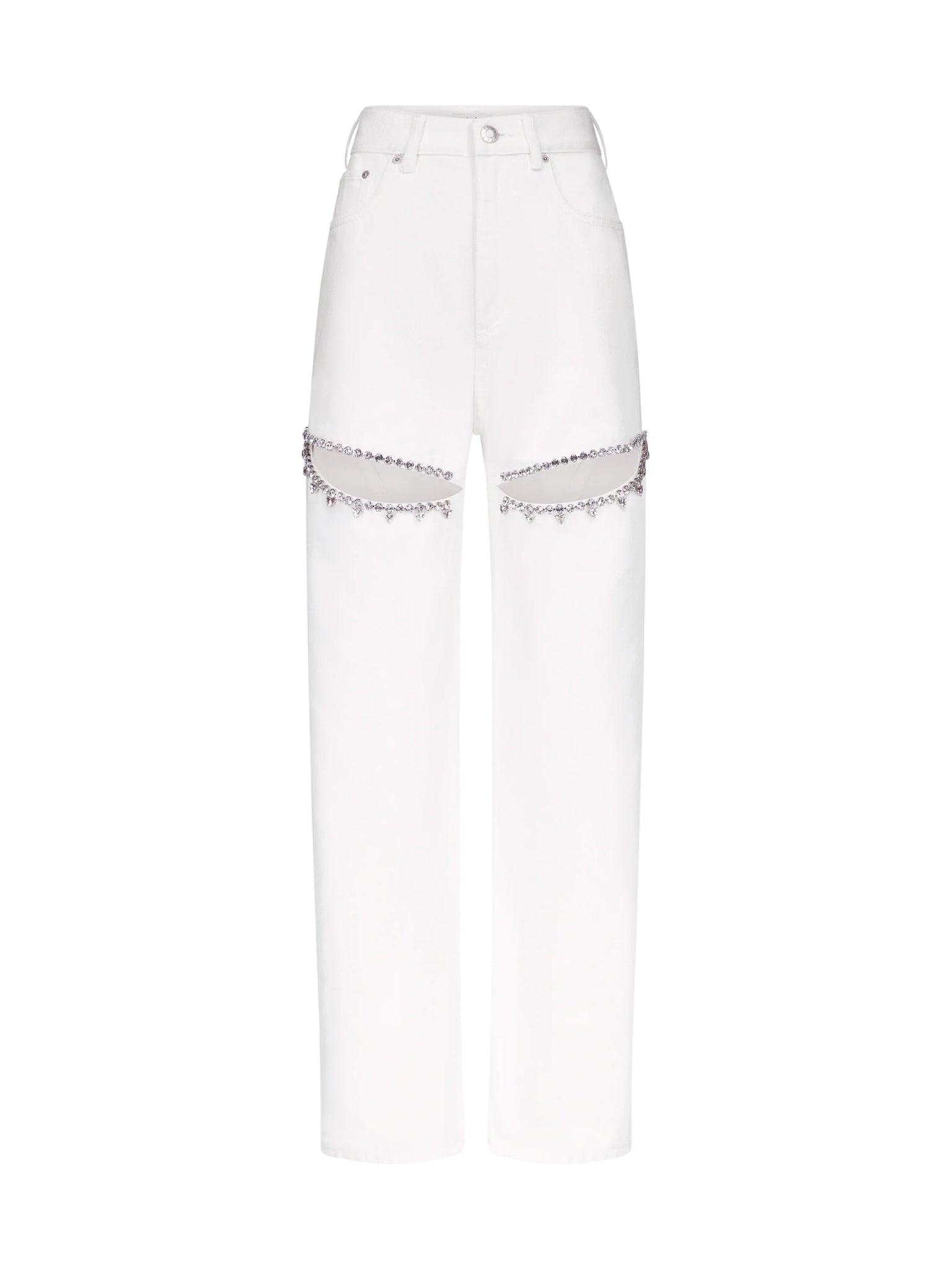 Bold meets refined in the Crystal Slit Jeans by AREA. Crafted from 100% cotton denim, this statement piece features crystal cupchain slit detailing at the thighs, merging edgy glamour with effortless street style.