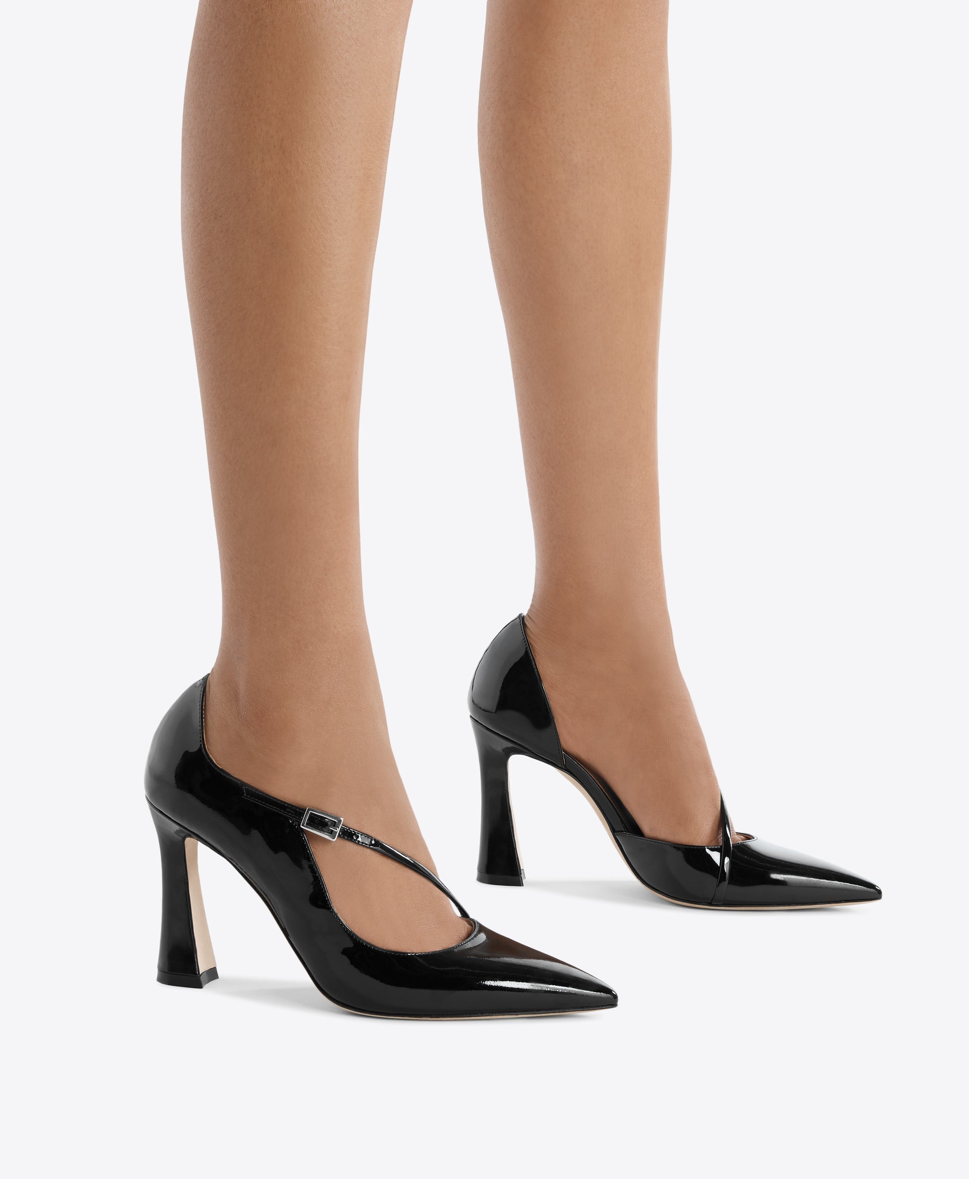 A new-season classic with a twist of modern glamour, the Bettina 90 pumps are crafted in glossy black patent leather. The timeless D’Orsay silhouette is elevated by architectural lines, a pointed toe, and Malone Souliers’ signature diagonal strap. Set on a flared 90mm block heel, these pumps blend elegance with contemporary edge.