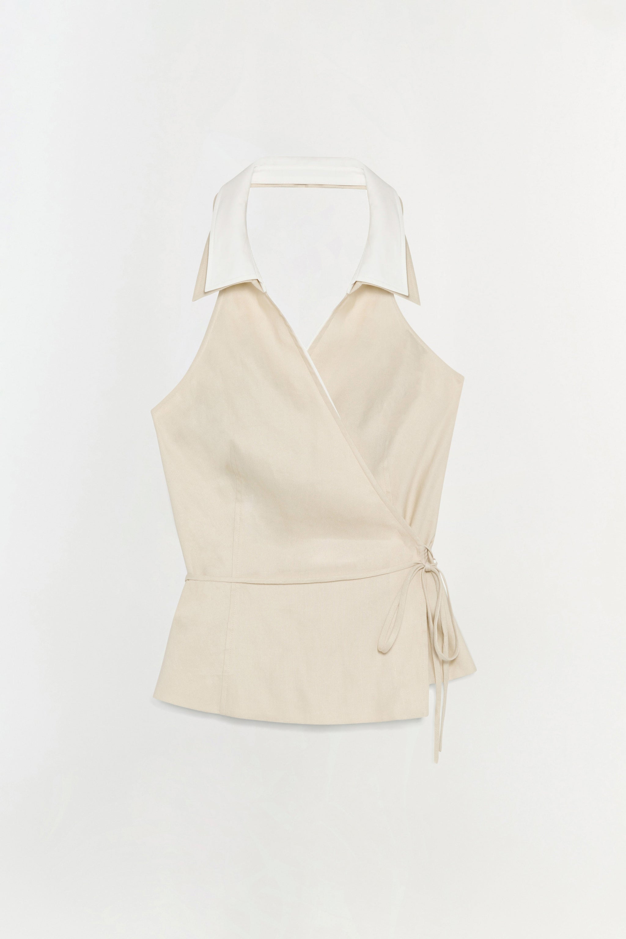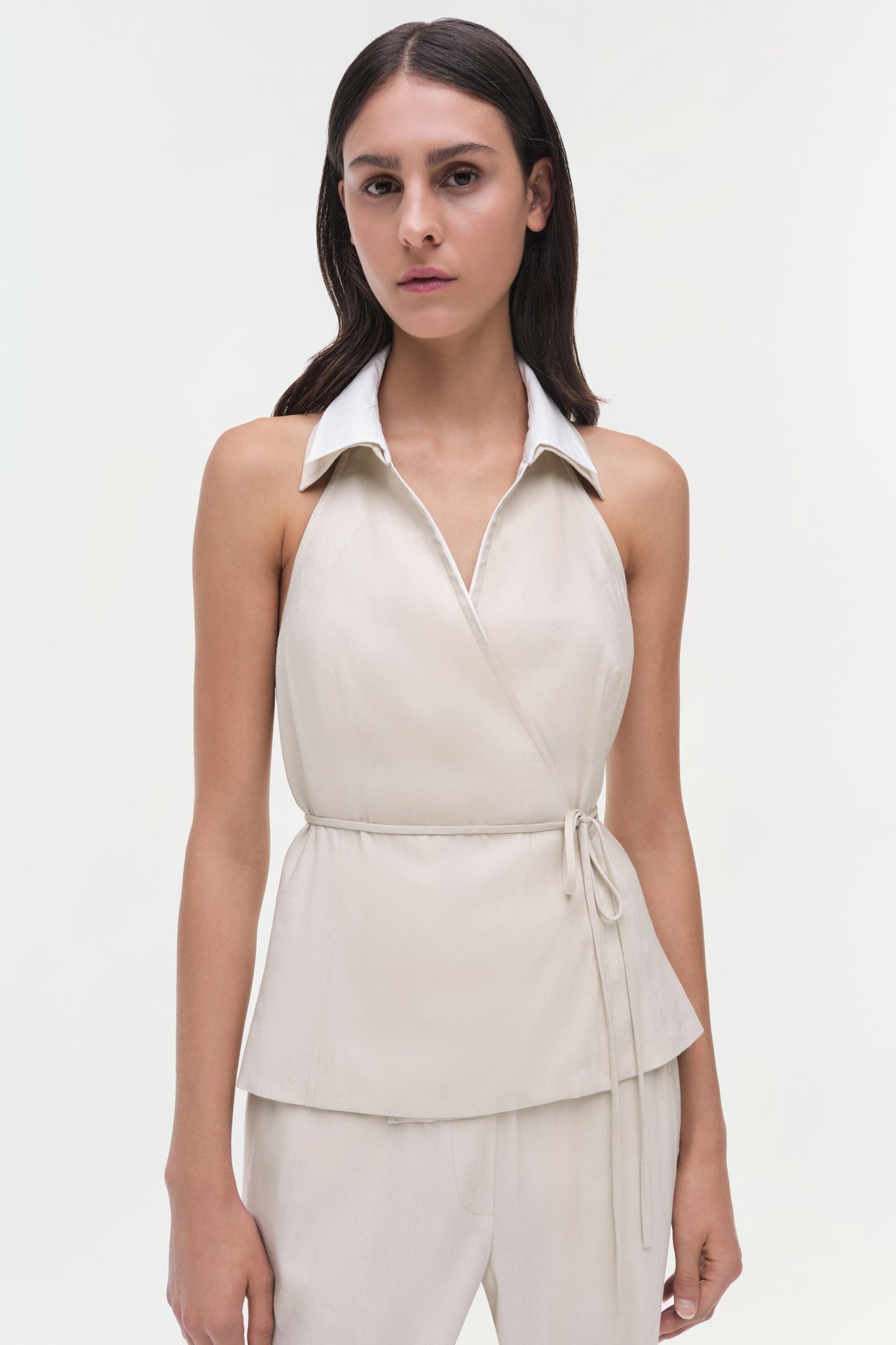 The Campbell Shirt in Sand Multi reimagines classic shirting with a bold, modern twist. Designed in a linen poplin blend, this halter-style top features a sharp collar and a sleek wrapped silhouette that flatters the body while offering a sophisticated edge. The sculpted fit makes it an ideal choice for elevated casualwear or smart summer layering, perfect for women in Saudi Arabia seeking a balance of polish and ease.