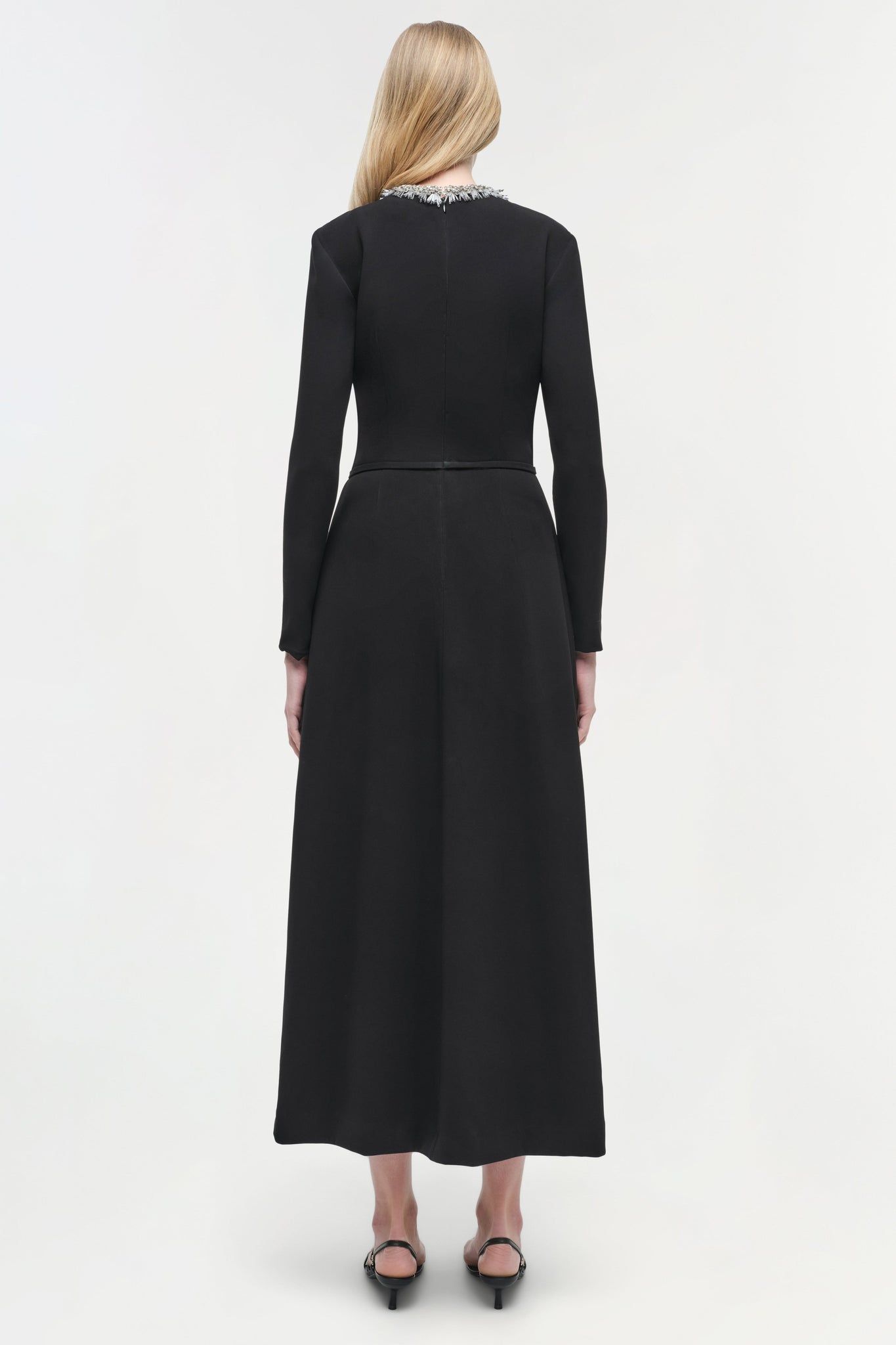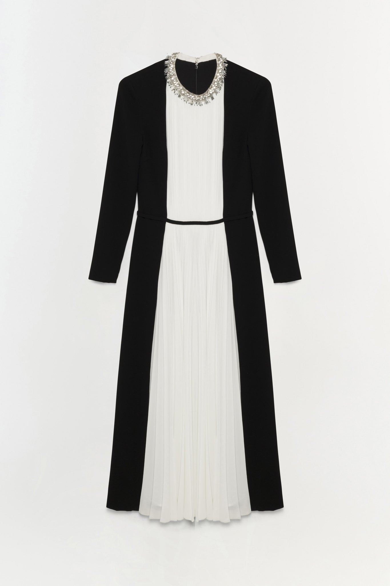 Graceful and sophisticated, the Esther Embellished Midi Dress by SIMKHAI features a harmonious blend of drapey crepe and flowing plisse fabric. With a striking silhouette and a delicate embellished collar, this dress is perfect for elegant occasions across Saudi Arabia.