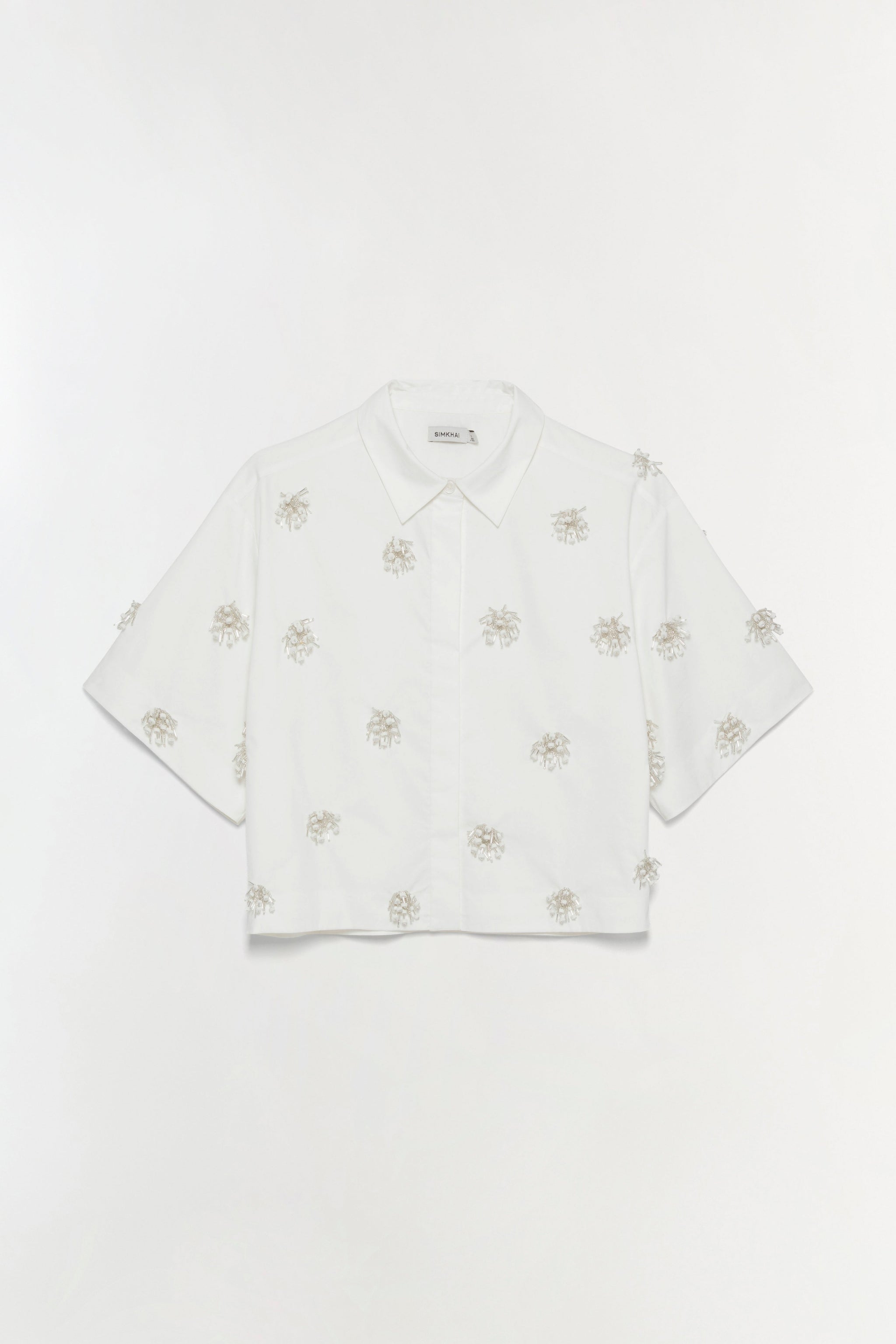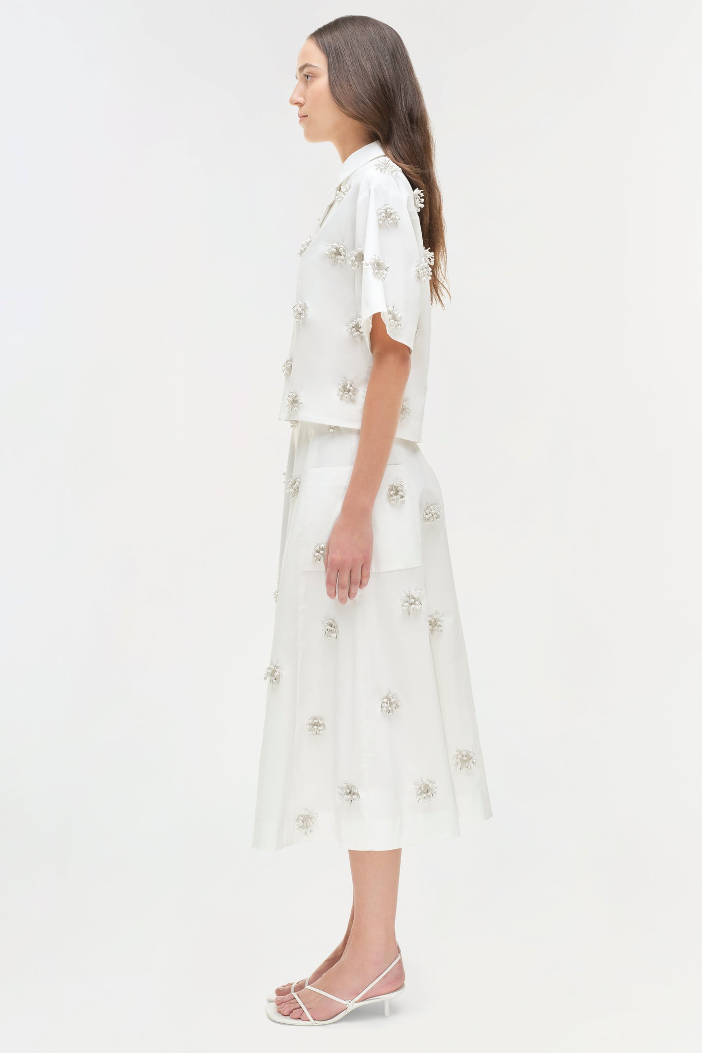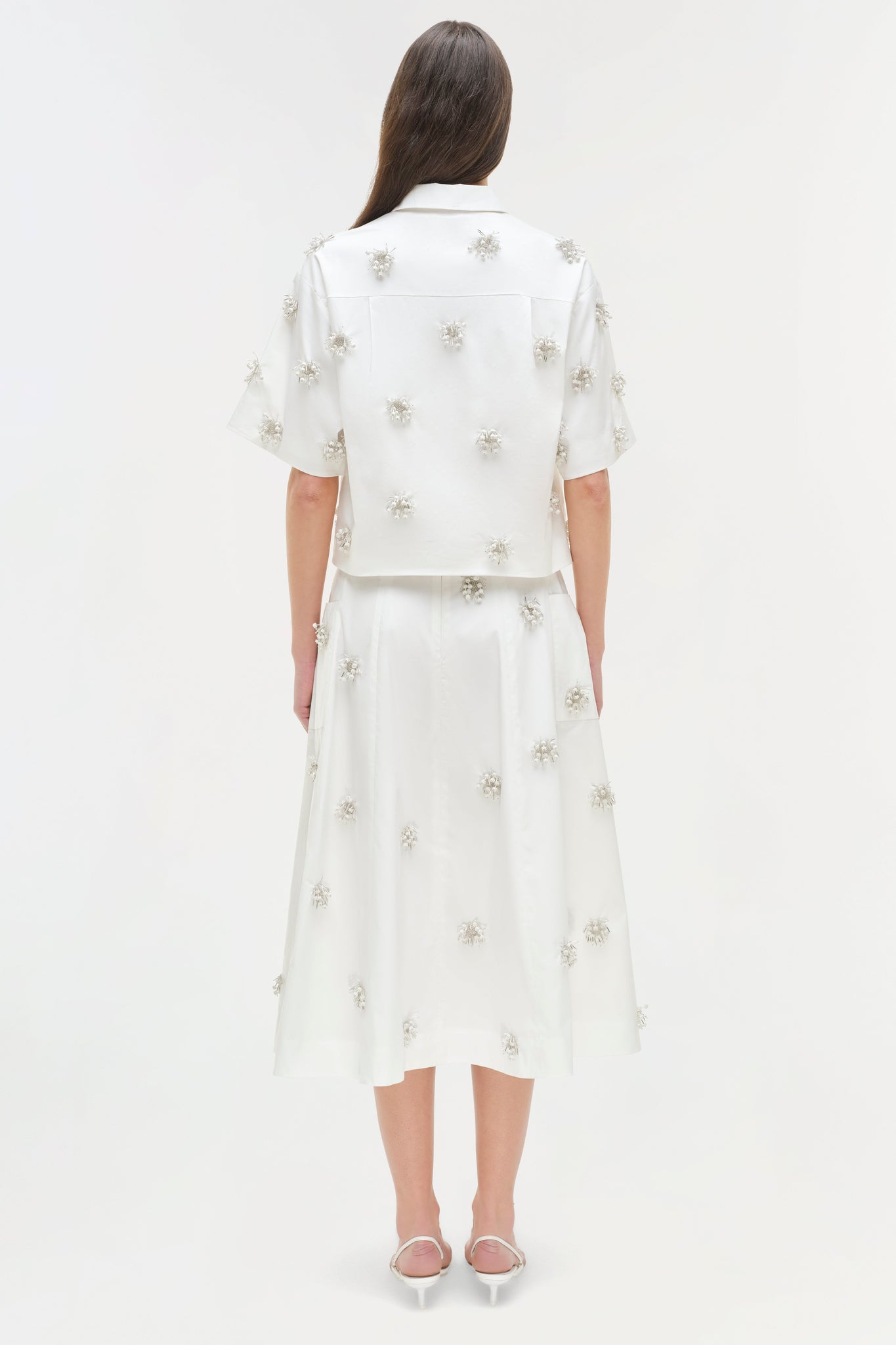 Modern elegance meets relaxed tailoring in the Cosmo Embellished Camp Shirt by SIMKHAI. Crafted from crisp cotton poplin, this shirt features intricate embellishments and a structured yet comfortable silhouette—perfect for refined daywear in the Saudi climate.