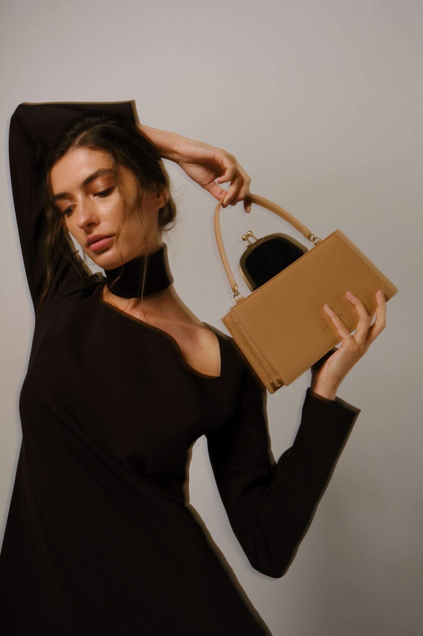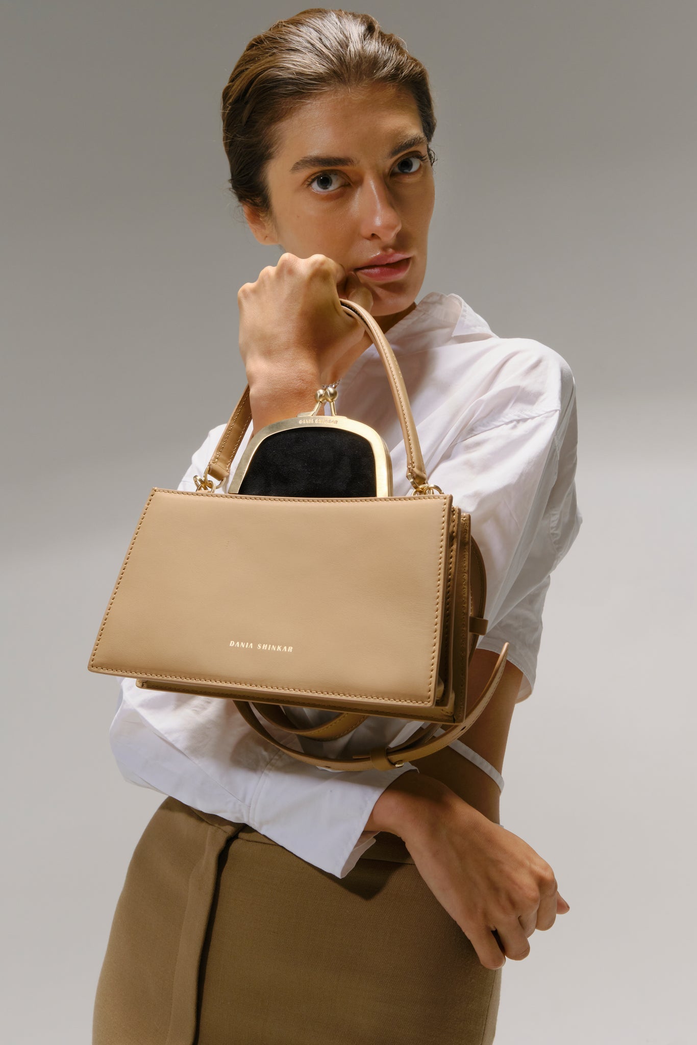 Sophistication in every detail — the MAJJ Bag in Black and Nutmeg by Dania Shinkar redefines modern elegance. Expertly crafted in Italy from rich kidskin suede and smooth nappa leather, this structured evening bag brings refined contrast and timeless charm to any occasion.