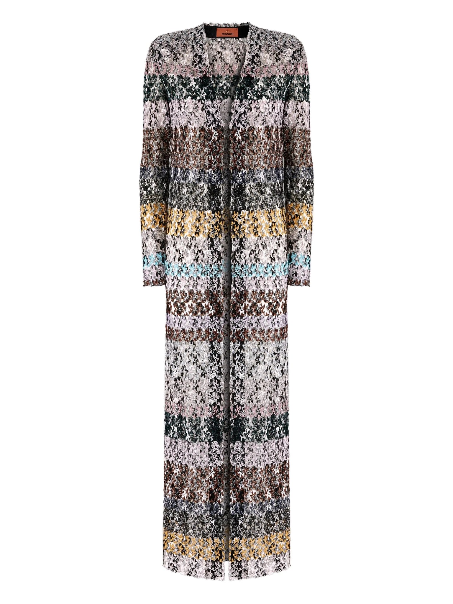 Sophisticated and contemporary, the Missoni Long Cardigan with Lace Straps is a statement piece that elevates any outfit. Crafted from a viscose blend with lamé threads, it features a V-neck and delicate raschel lace in a striped pattern, offering subtle shine and refined elegance for women who appreciate luxury and style.
