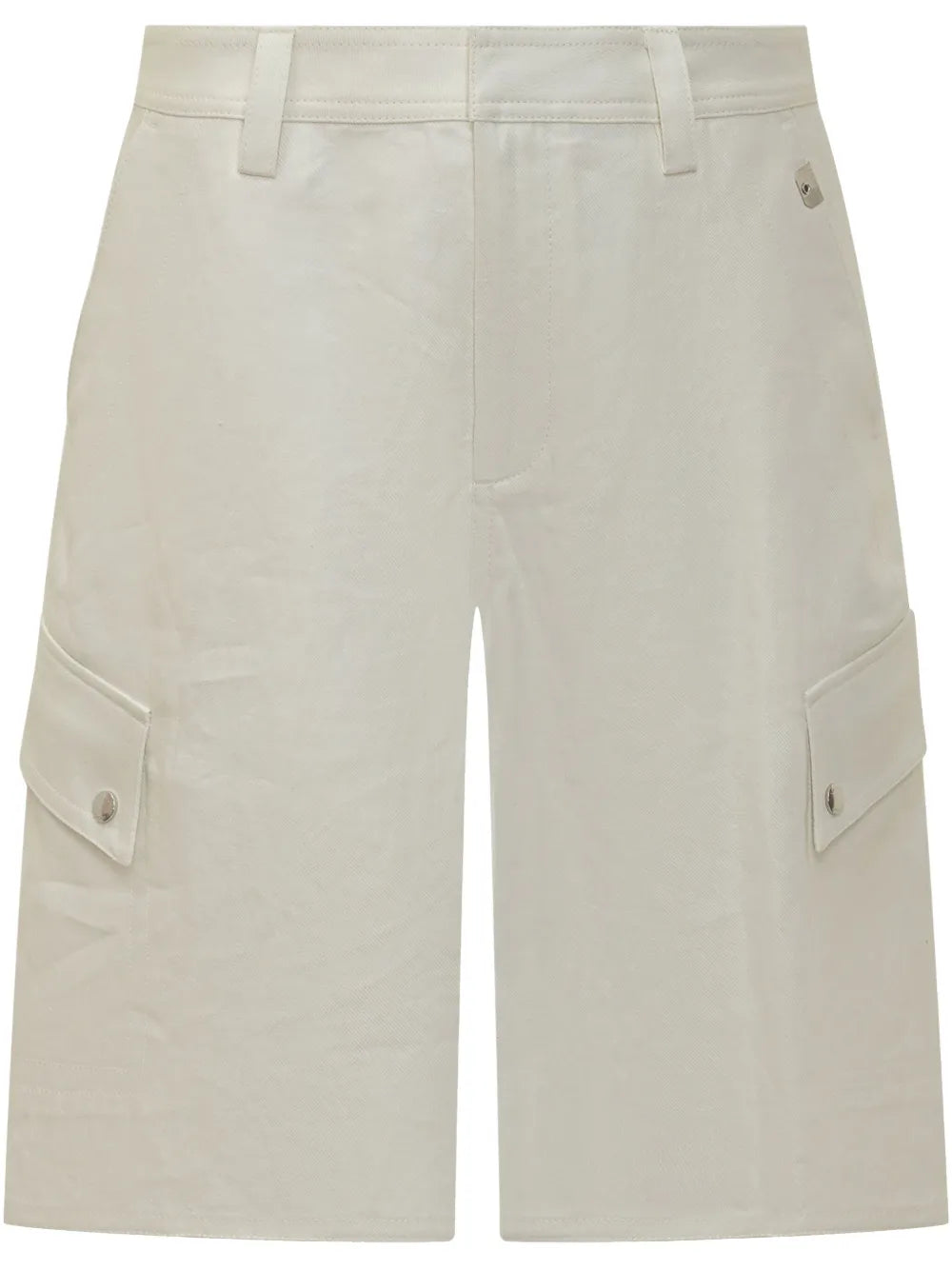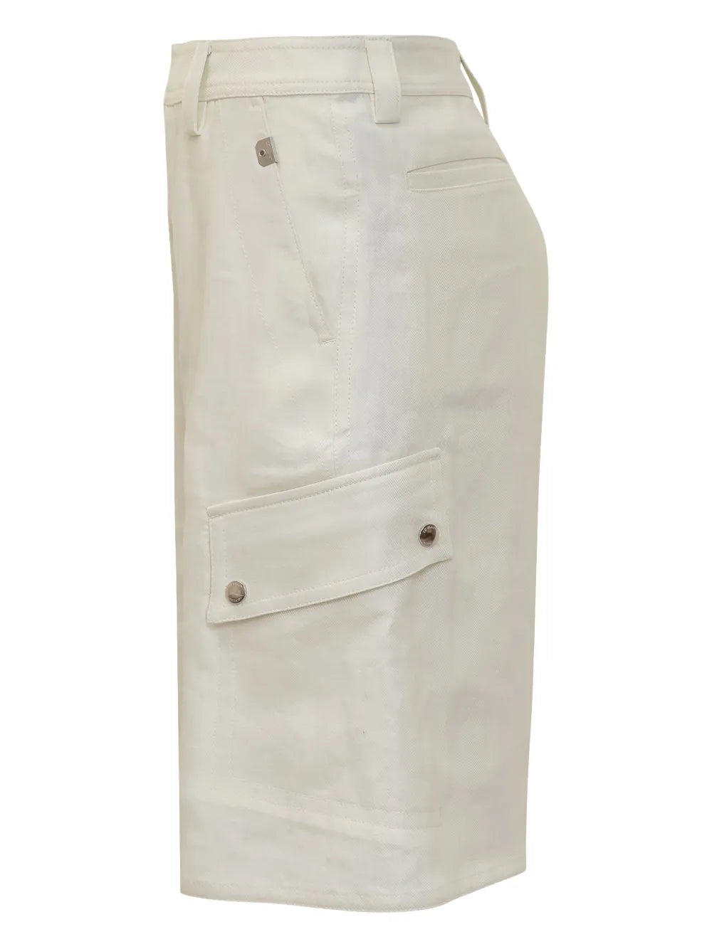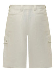 Refresh your summer wardrobe with the Off-White Linen Shorts, designed for both comfort and style. These white shorts feature a concealed front fastening, ensuring a clean silhouette. Two side cargo pockets and two rear jetted pockets add practical storage, while the belt loops allow for a personalized fit. Crafted from lightweight linen, these shorts offer a breathable and relaxed option for warm-weather days.
