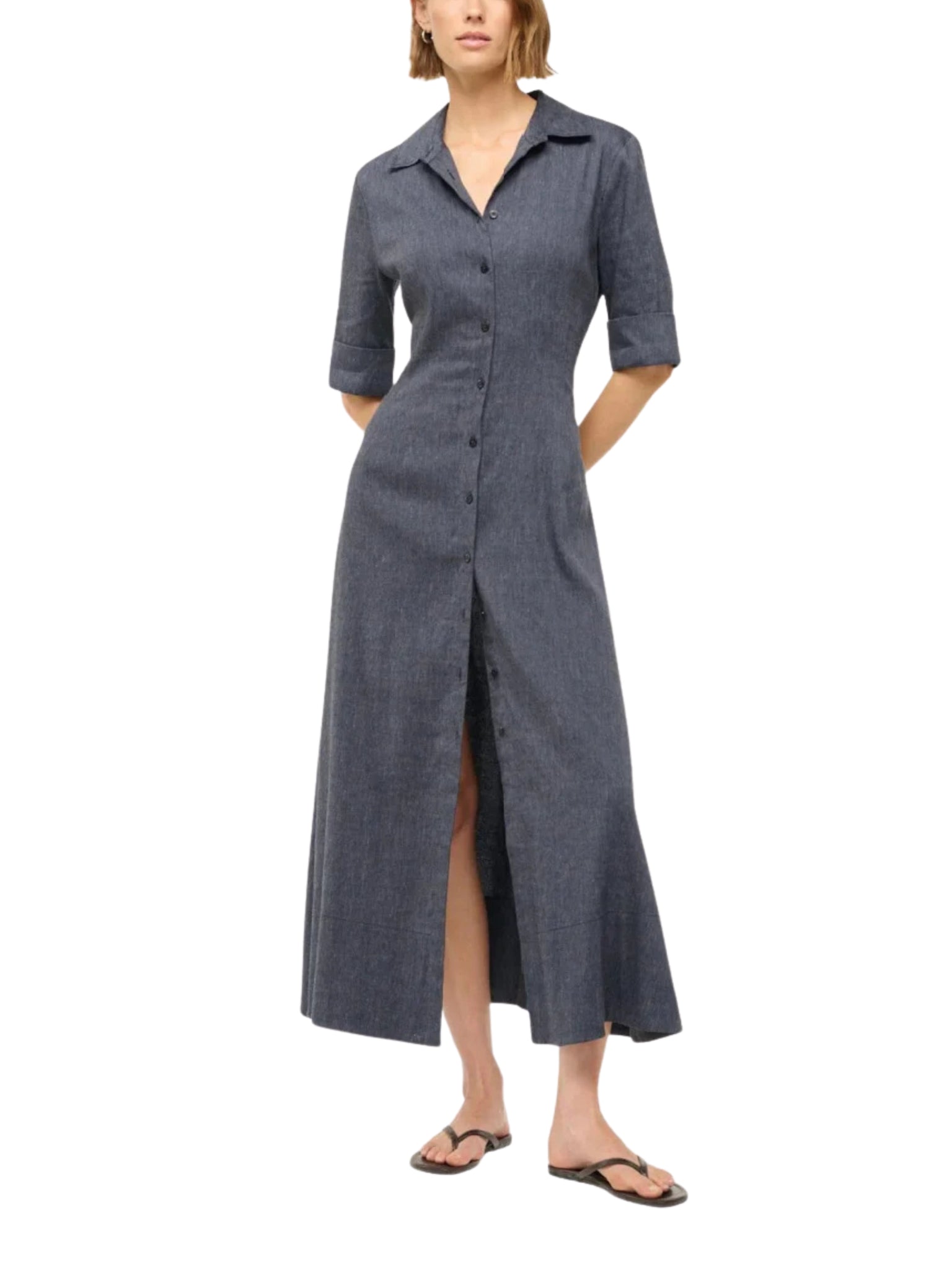 A modern classic — the Joan Linen Dress in chambray brings together sharp tailoring and everyday ease in a flattering maxi shirt dress silhouette.