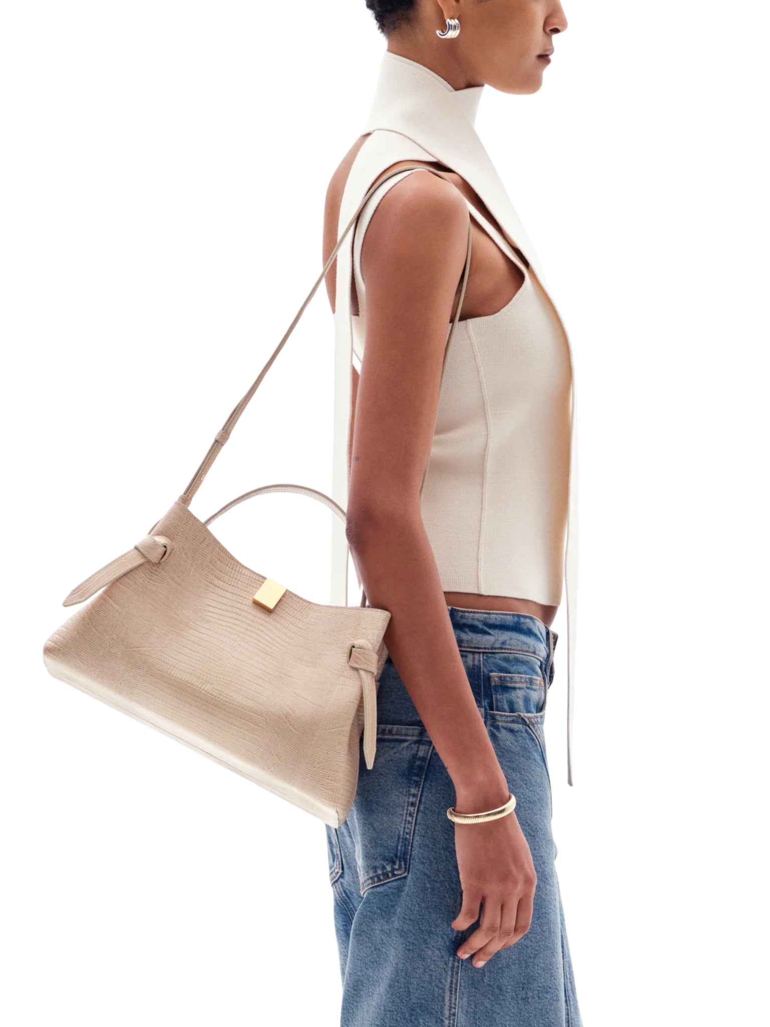 Sculptural and sophisticated, the Gyoza Crossbody Bag by Yuzefi is crafted from premium embossed lizard cowhide leather for a unique texture and elevated finish. With its sleek, compact silhouette, it's the perfect everyday luxury piece that holds your essentials with refined elegance.