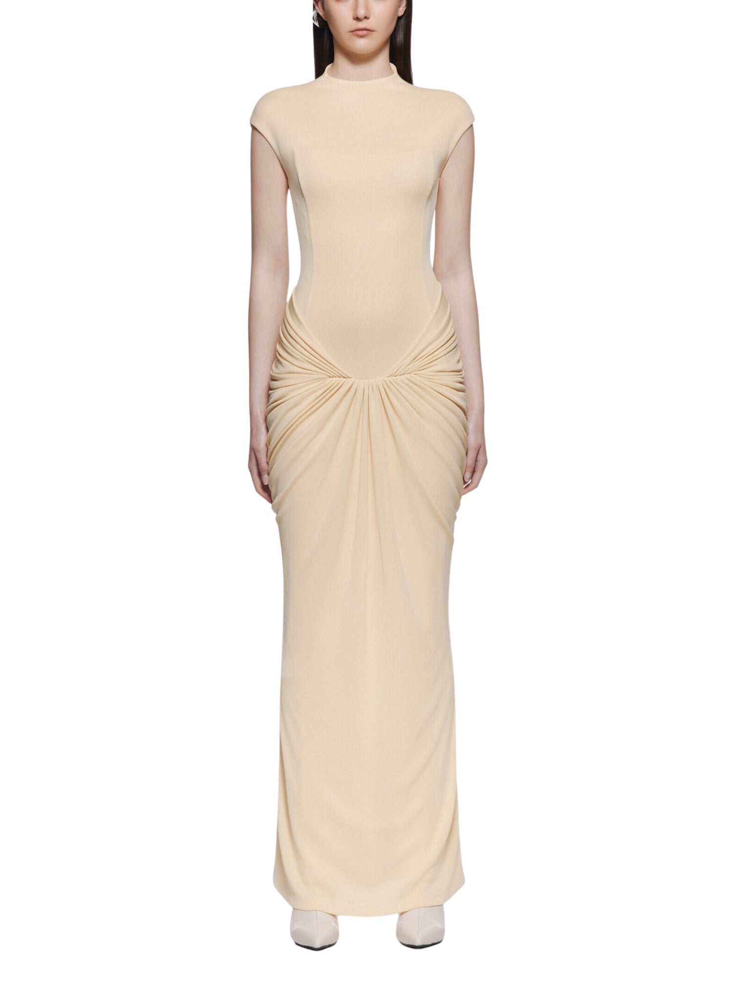 Command attention in this striking yellow long dress by Chats by C.Dam, designed to sculpt and elevate the female form. Crafted from luxurious interlock knit, this form-fitting silhouette features gathered draping at the hipline and a bold-cut bodice panel that creates dimension and visual intrigue. Radiating confidence and energy, it’s the perfect statement piece for upscale events, galas, or evening occasions in Saudi Arabia.
