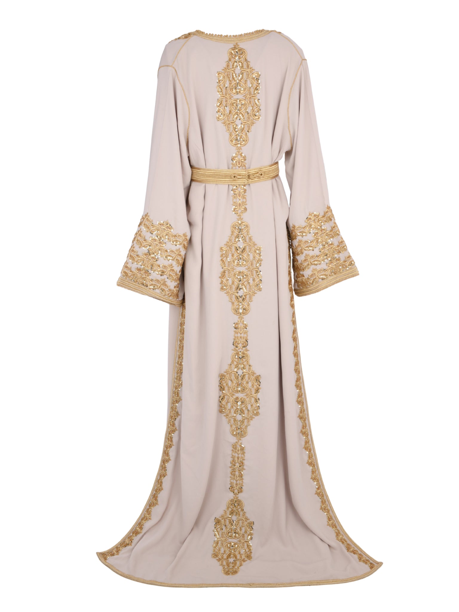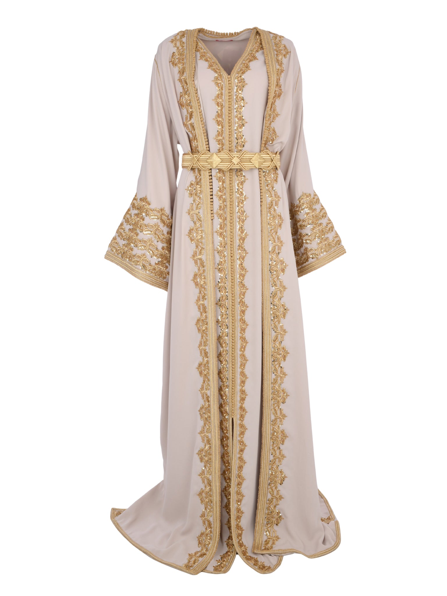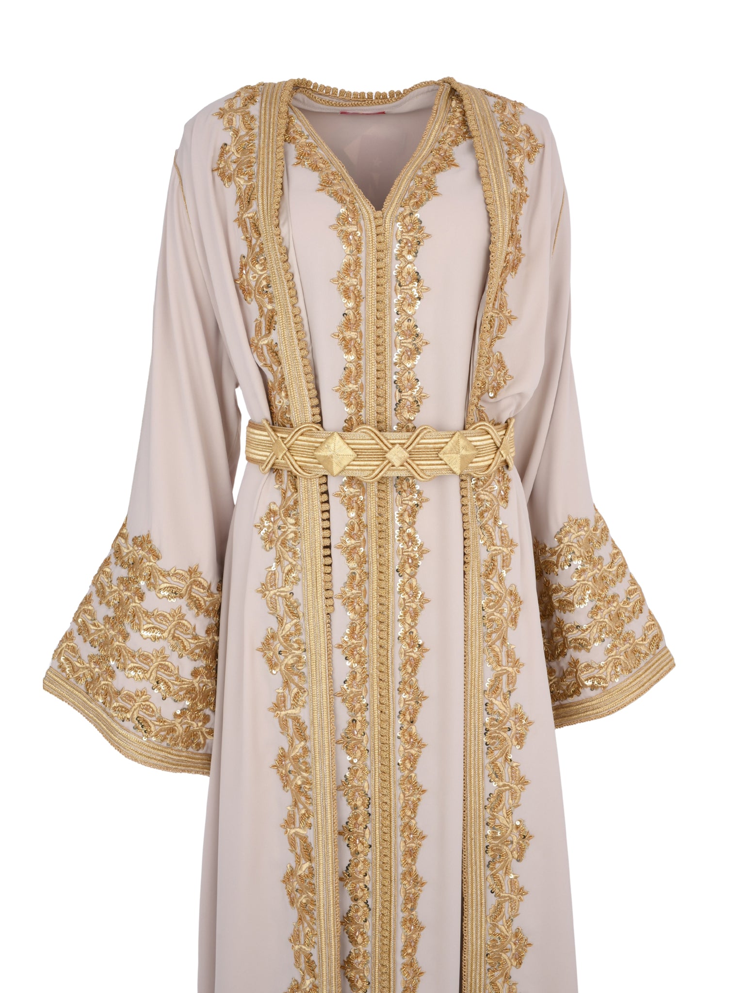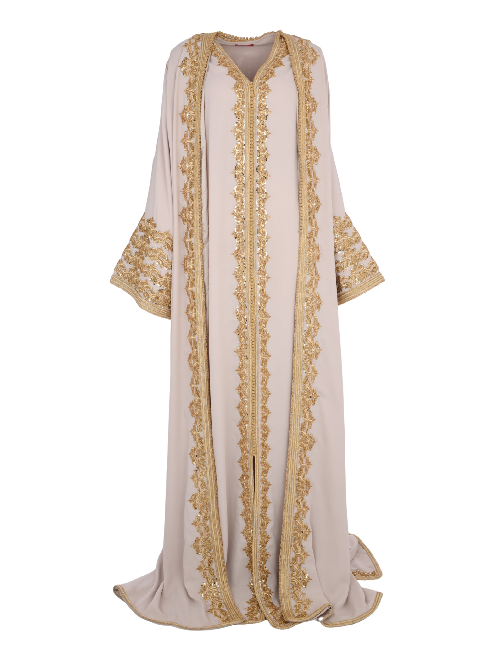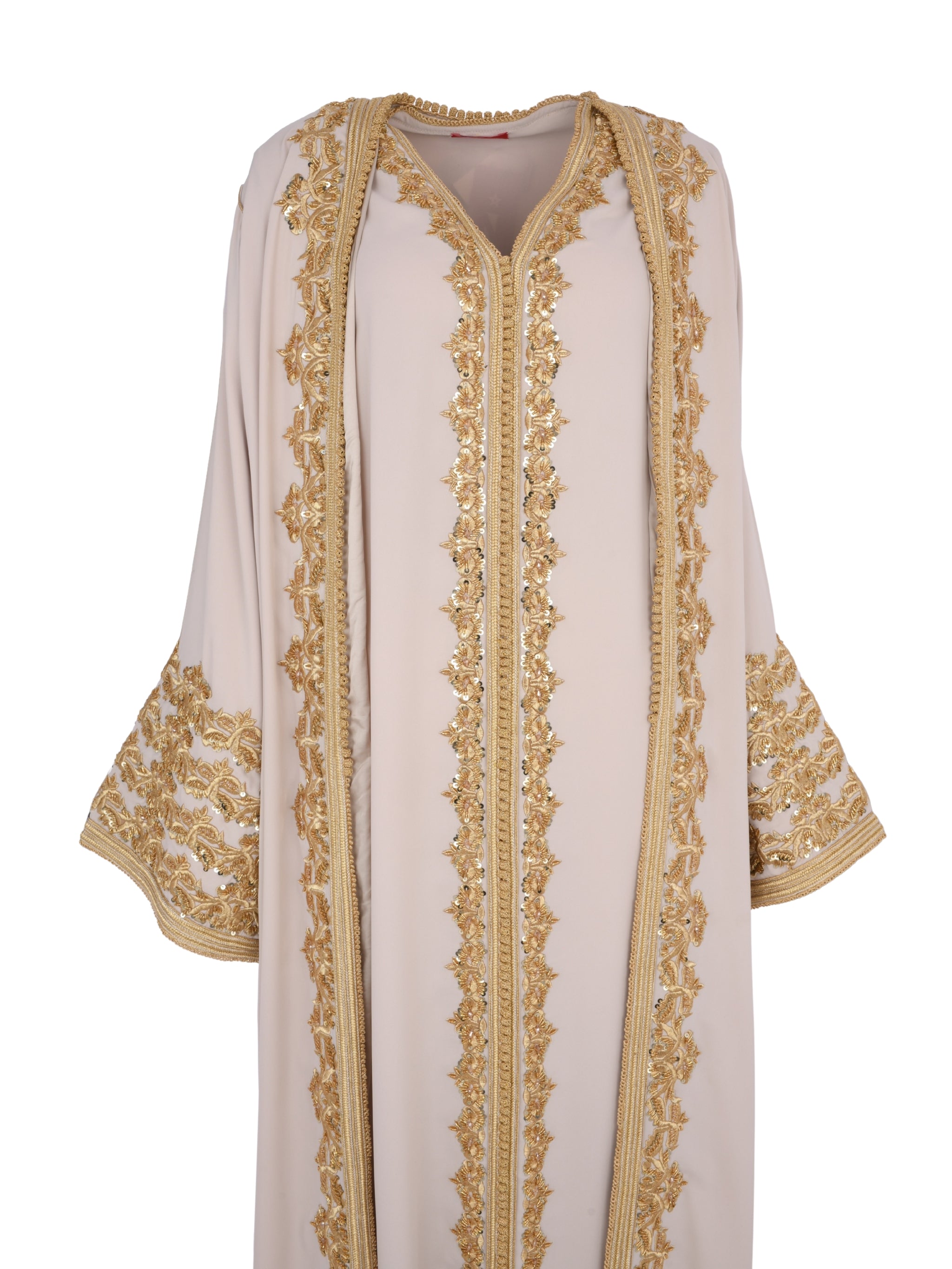 A refined two-piece caftan that embodies pure elegance and modern sophistication. Designed with graceful simplicity, this white caftan offers a timeless and polished look, perfect for elevated occasions and refined gatherings.