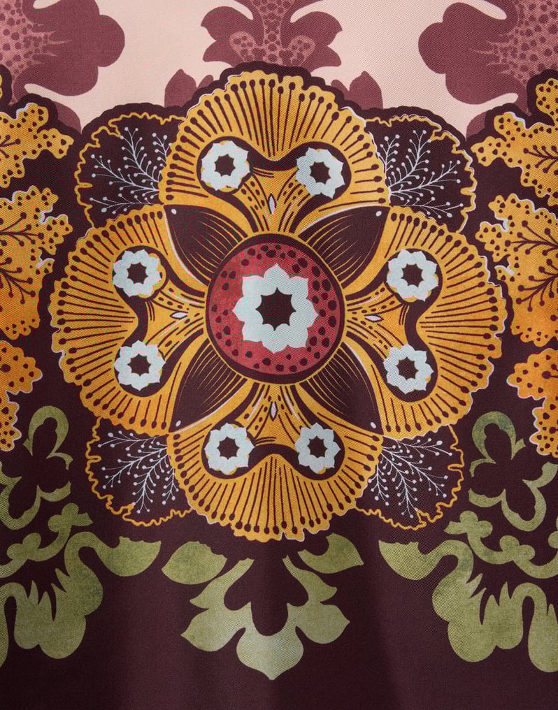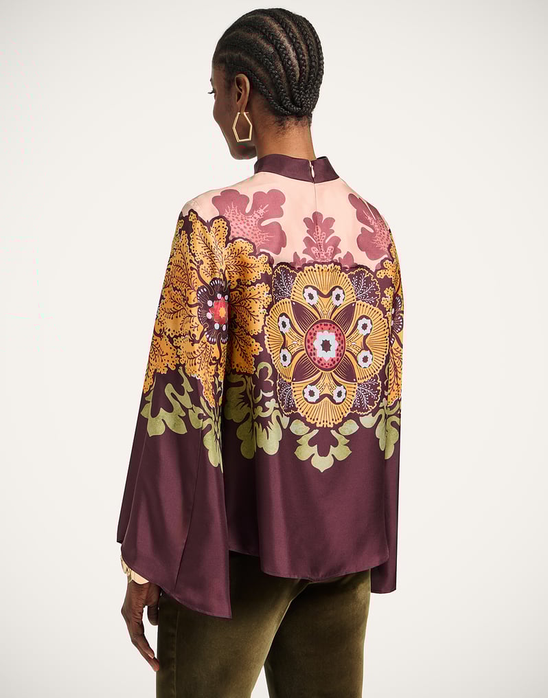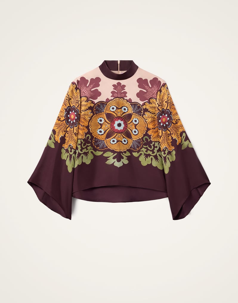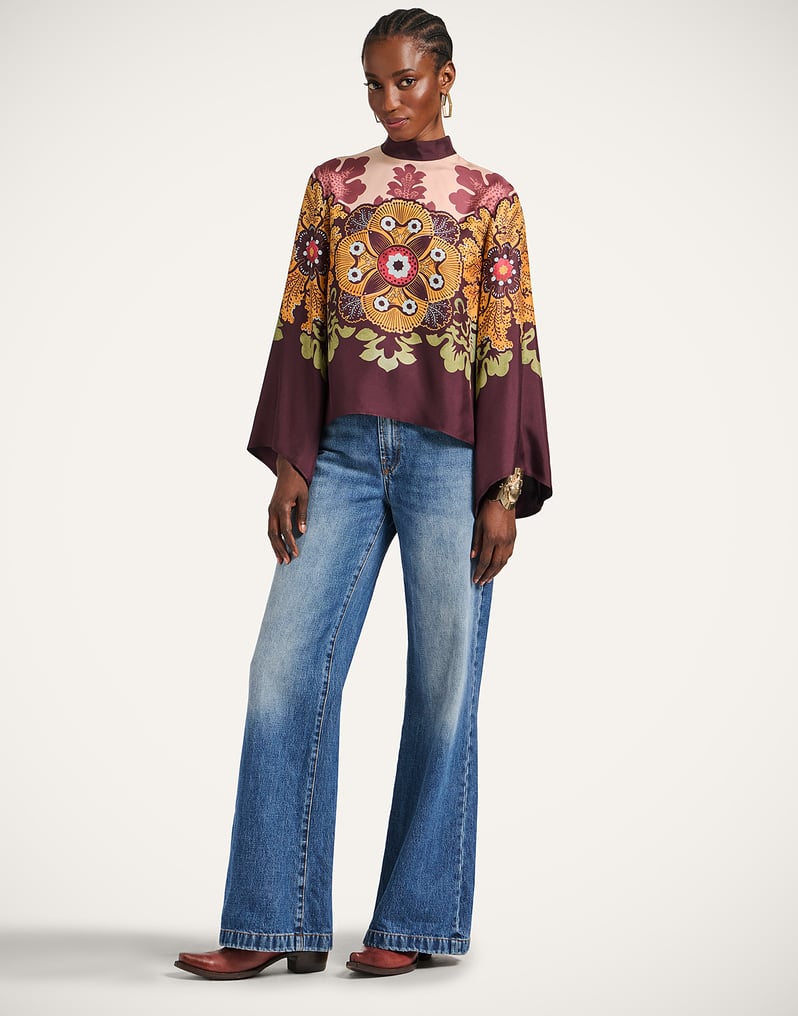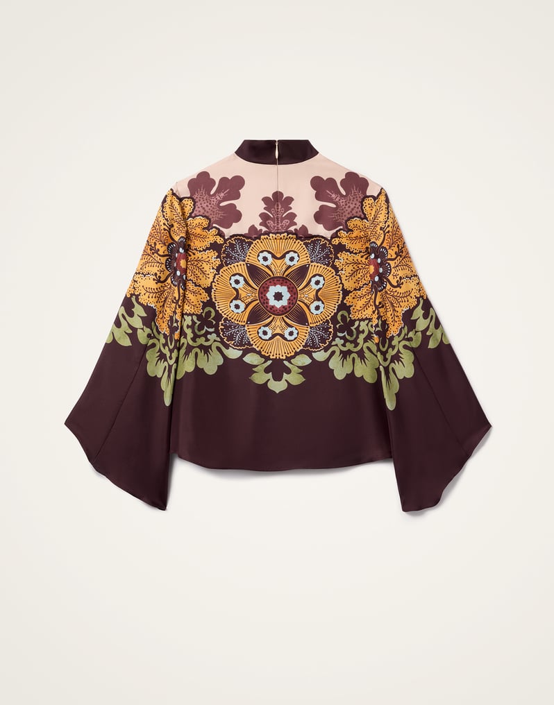 The MAKE AN EXIT TOP is flirtatiously elegant, perfect for turning heads with understated drama. With a high neck and A-line silhouette at the front, it exudes subtle sophistication, while the cape-like high-low back delivers a show-stopping, floaty effect with every turn. Crafted in luxurious peachy silk satin, the oversized bell sleeves add a touch of date-night drama, making this top a versatile statement piece for any occasion. Layer it under a gilet or with the Folk Jacket for bohemian flair, or pair with the Milano Skirt for a refined, evening-ready look.