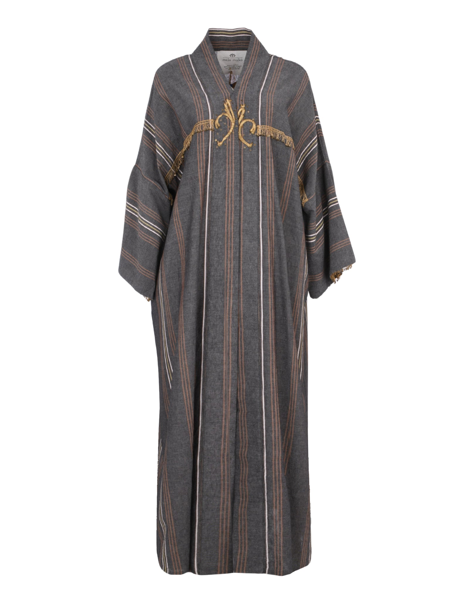 A timeless black Sirma kaftan by Moja Majka, designed to embody refined elegance with a modern silhouette. Its sleek tone and flowing structure reflect contemporary Saudi luxury with effortless sophistication.
