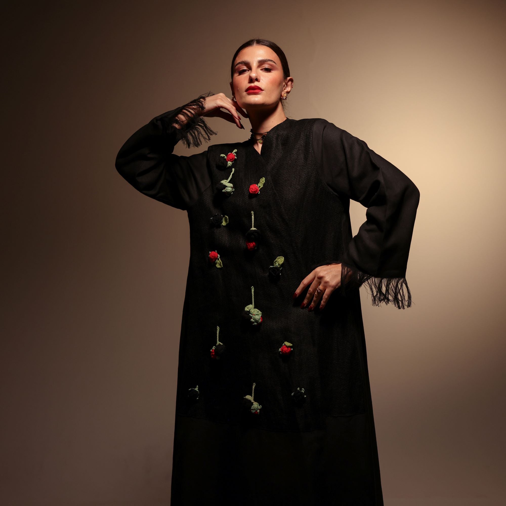 A timeless black abaya by NASHL, designed for effortless elegance. Clean lines and a refined silhouette come together to create a versatile piece that reflects modern Saudi luxury and understated sophistication.