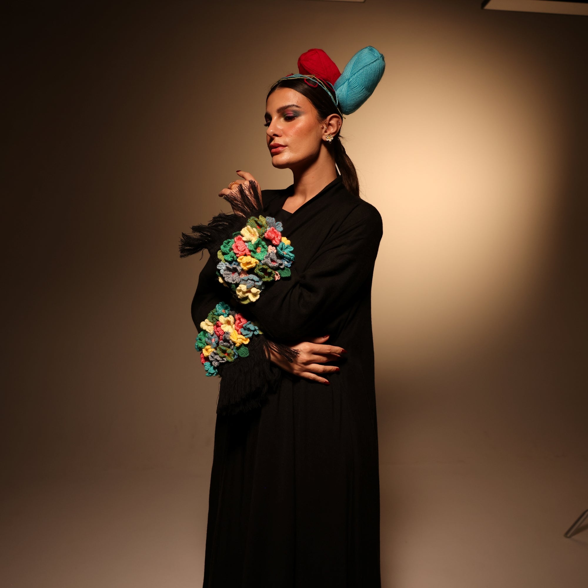 A timeless black abaya by NASHL, designed to reflect understated elegance. With a clean silhouette and effortless flow, this piece captures modern Saudi luxury and everyday sophistication.