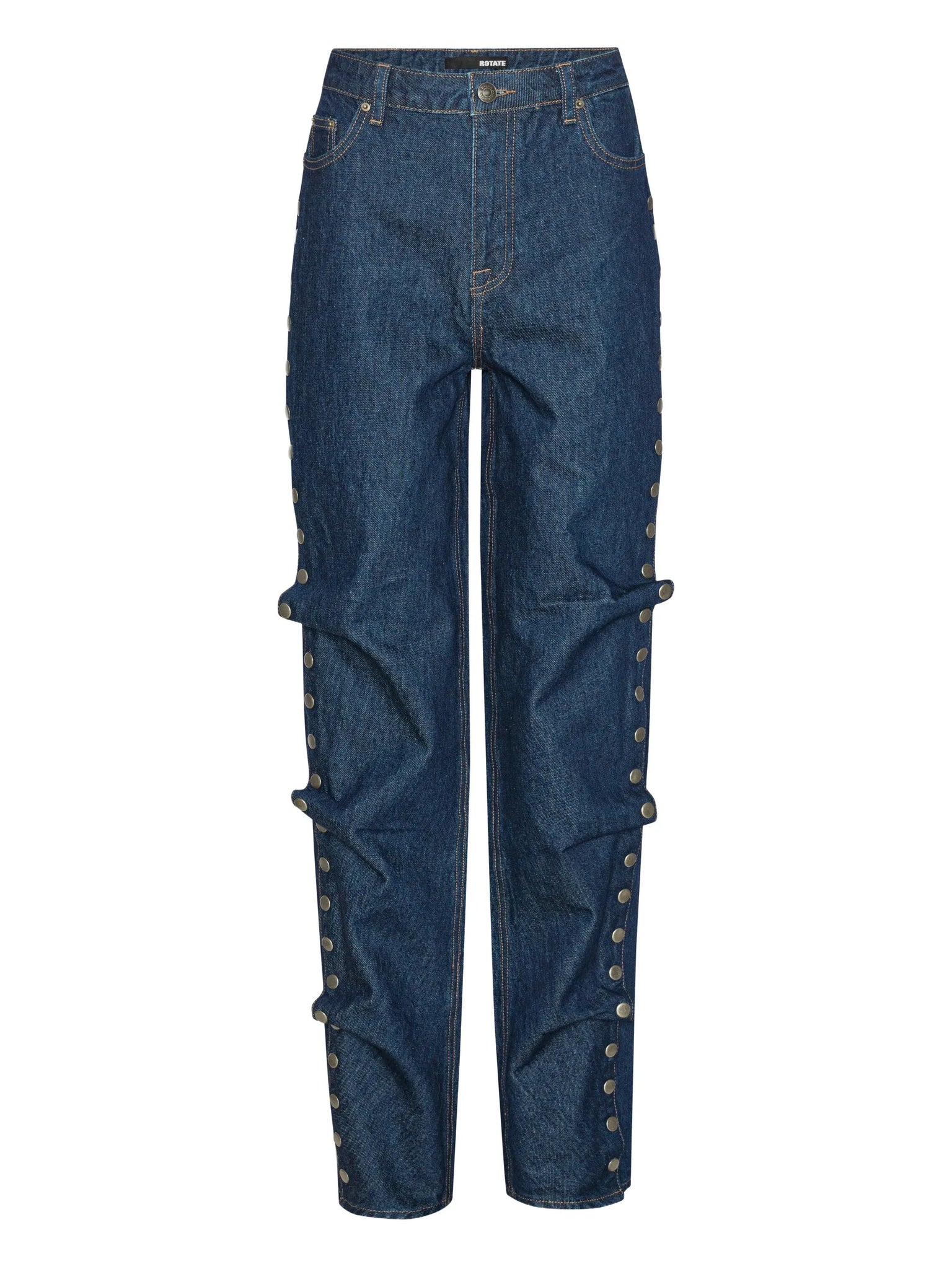 Modern yet effortless, these dark blue buttoned wide leg jeans combine classic denim craftsmanship with contemporary detailing, perfect for elevated casual styling.