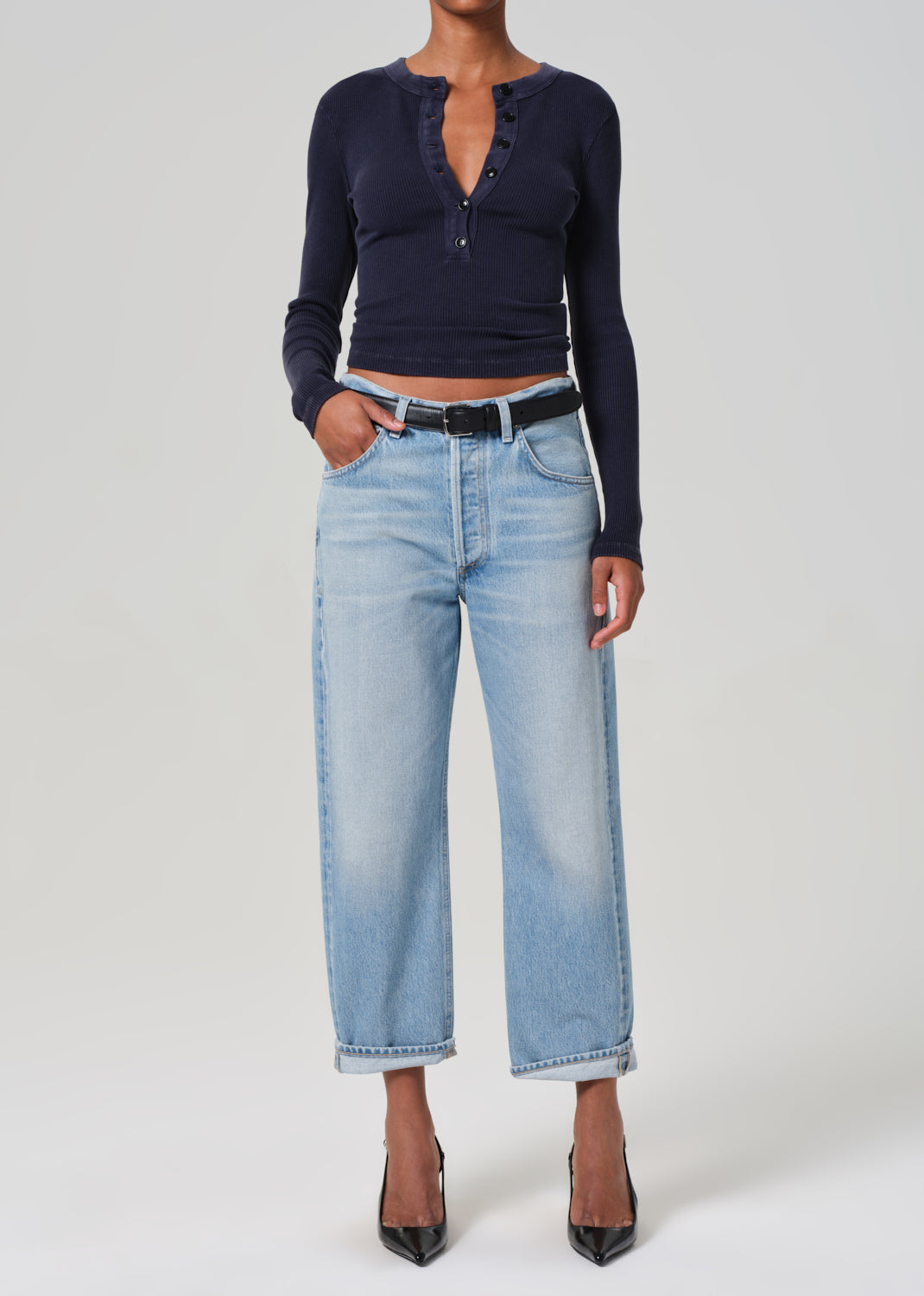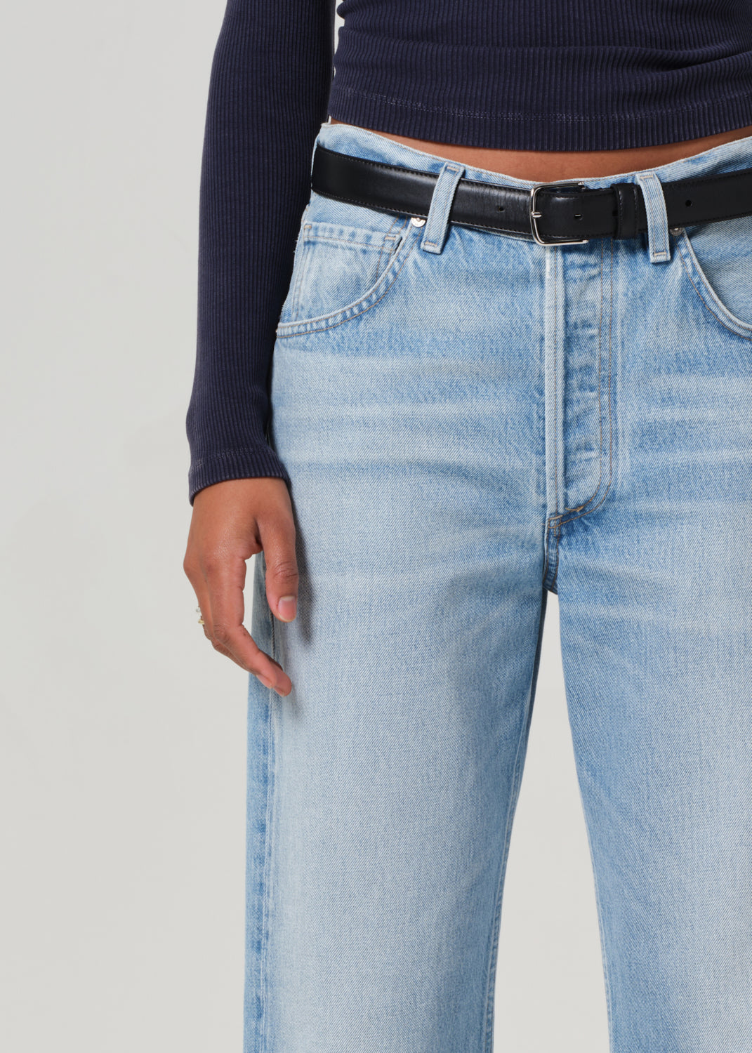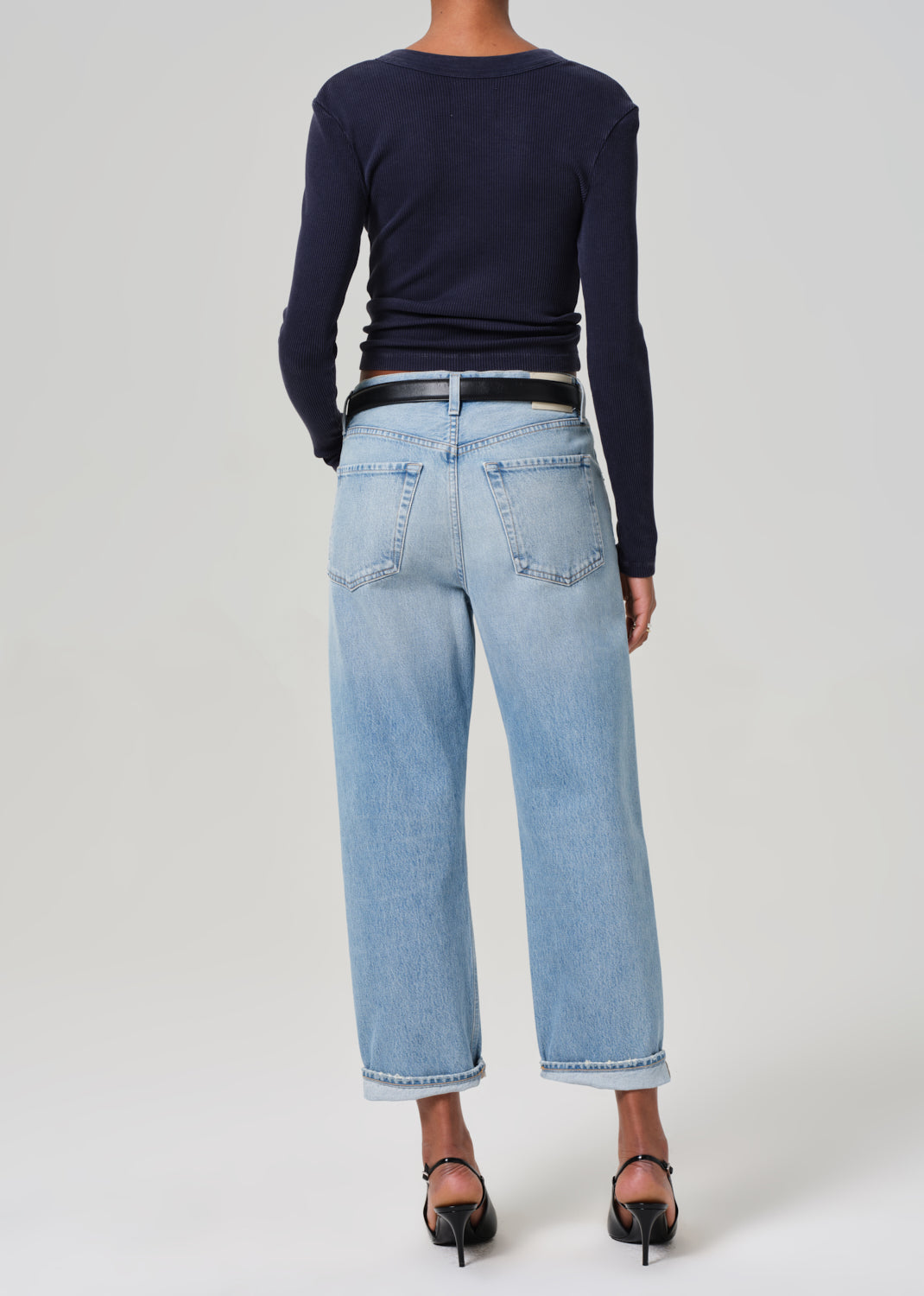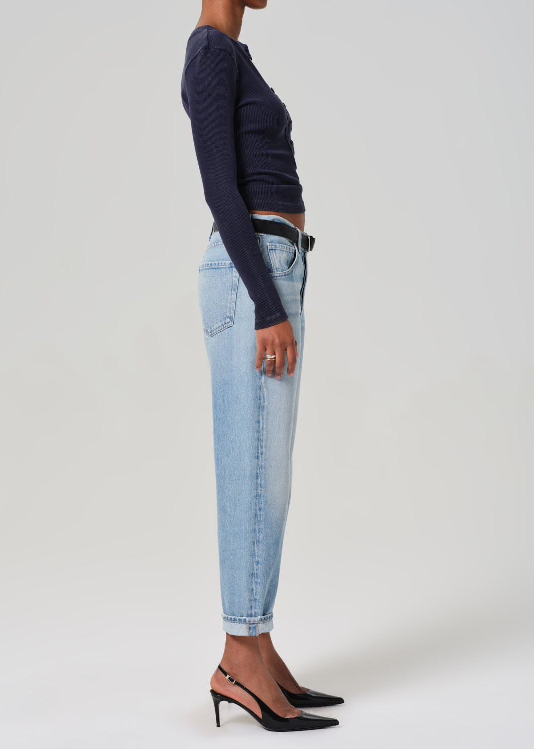 The Dahlia Bow Leg Baby Roll jeans from AGOLDE offer a relaxed, vintage-inspired silhouette. Designed to sit low on the hips, these jeans feature a tapered leg with a unique, uneven baby rolled cuff for added charm. Crafted from regenerative cotton, they have a non-stretch, rigid feel that gives them a classic, timeless look. Perfect for those who appreciate vintage details and sustainable materials.