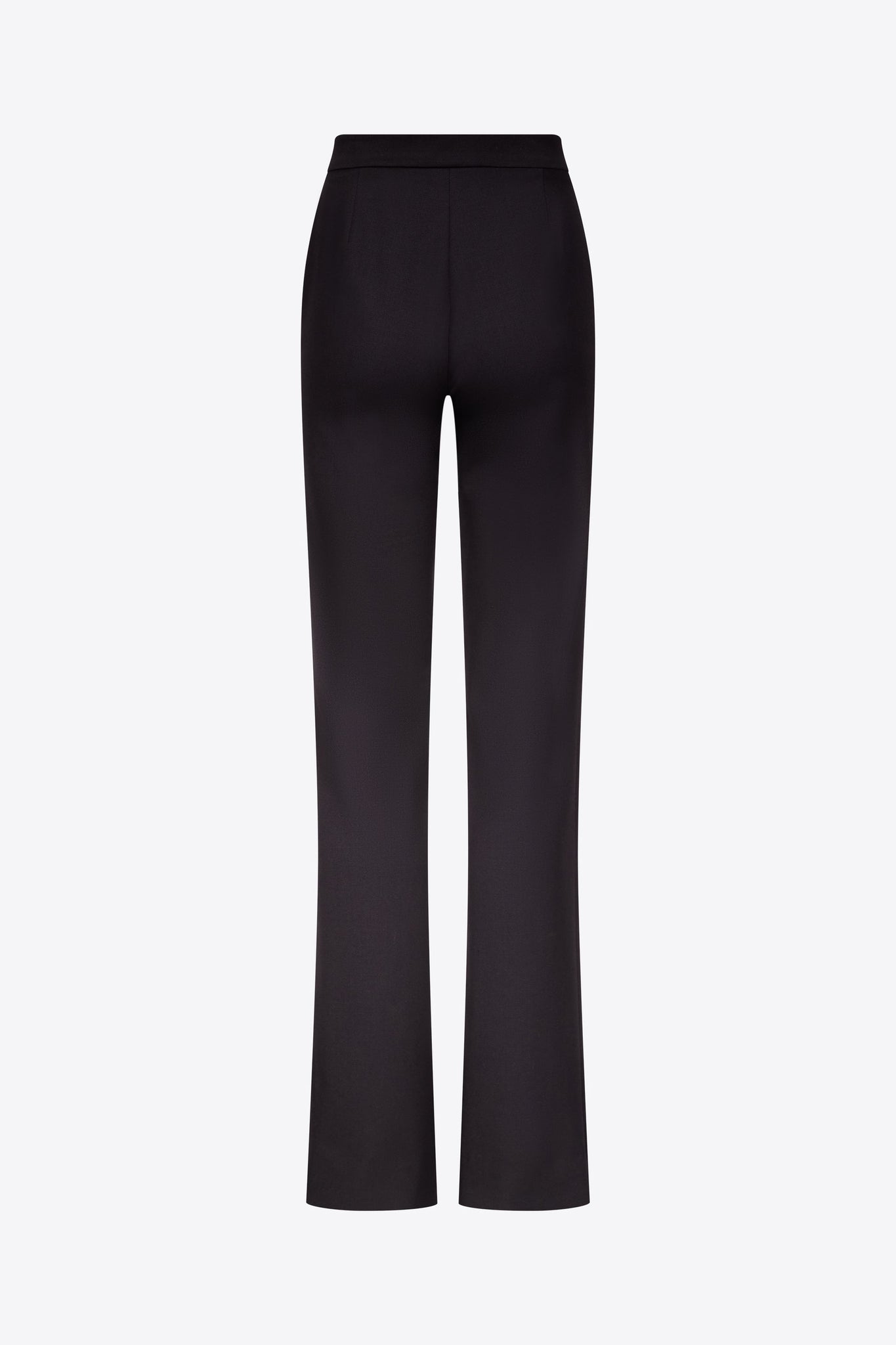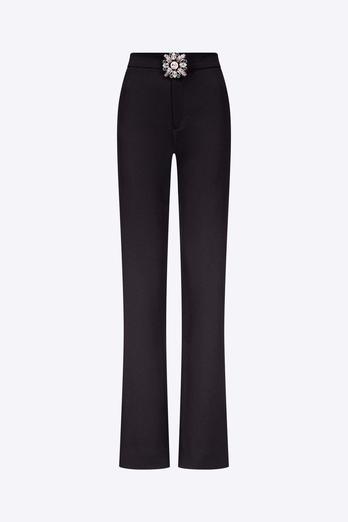 Tailored sophistication meets subtle glamour. These straight-leg trousers are crafted from premium wool suiting and adorned with delicate crystal brooch embellishments. A front button closure ensures a clean, structured finish. Available in timeless Black and Whipped White.