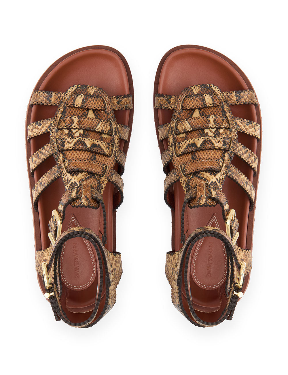 The Goldie Gladiator in Toffee by Zimmermann blends refined craftsmanship with statement design. Crafted in Spain from snake-printed goat leather, this elevated flatform sandal is detailed with laser-cut scalloped edges, gold hardware, and adjustable straps perfect for adding an effortless edge to your summer wardrobe.