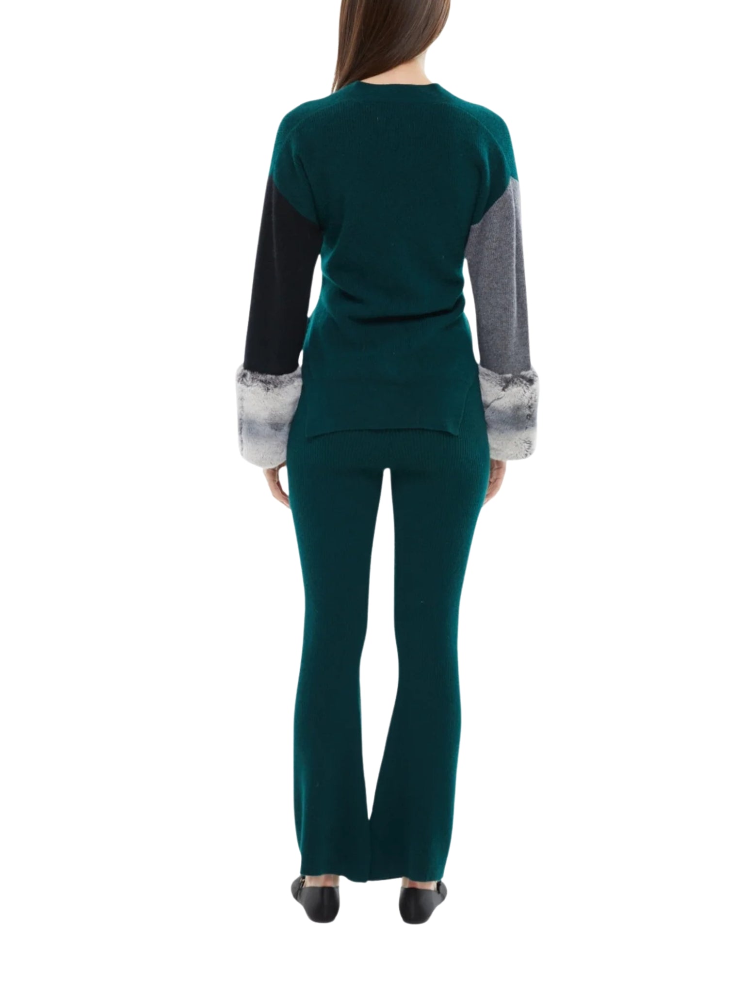 A luxurious cardigan from Izaak Azanei, featuring tie-detailed cuffs and crafted from a merino wool-cashmere blend with rex rabbit fur accents, offering warmth, elegance, and versatile styling in Saudi Arabia.