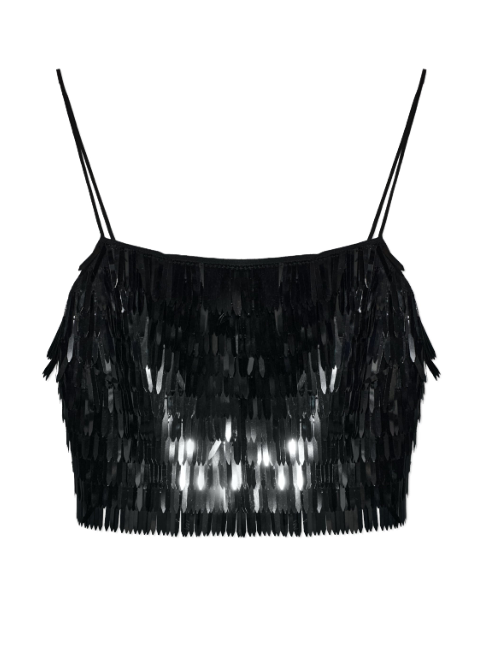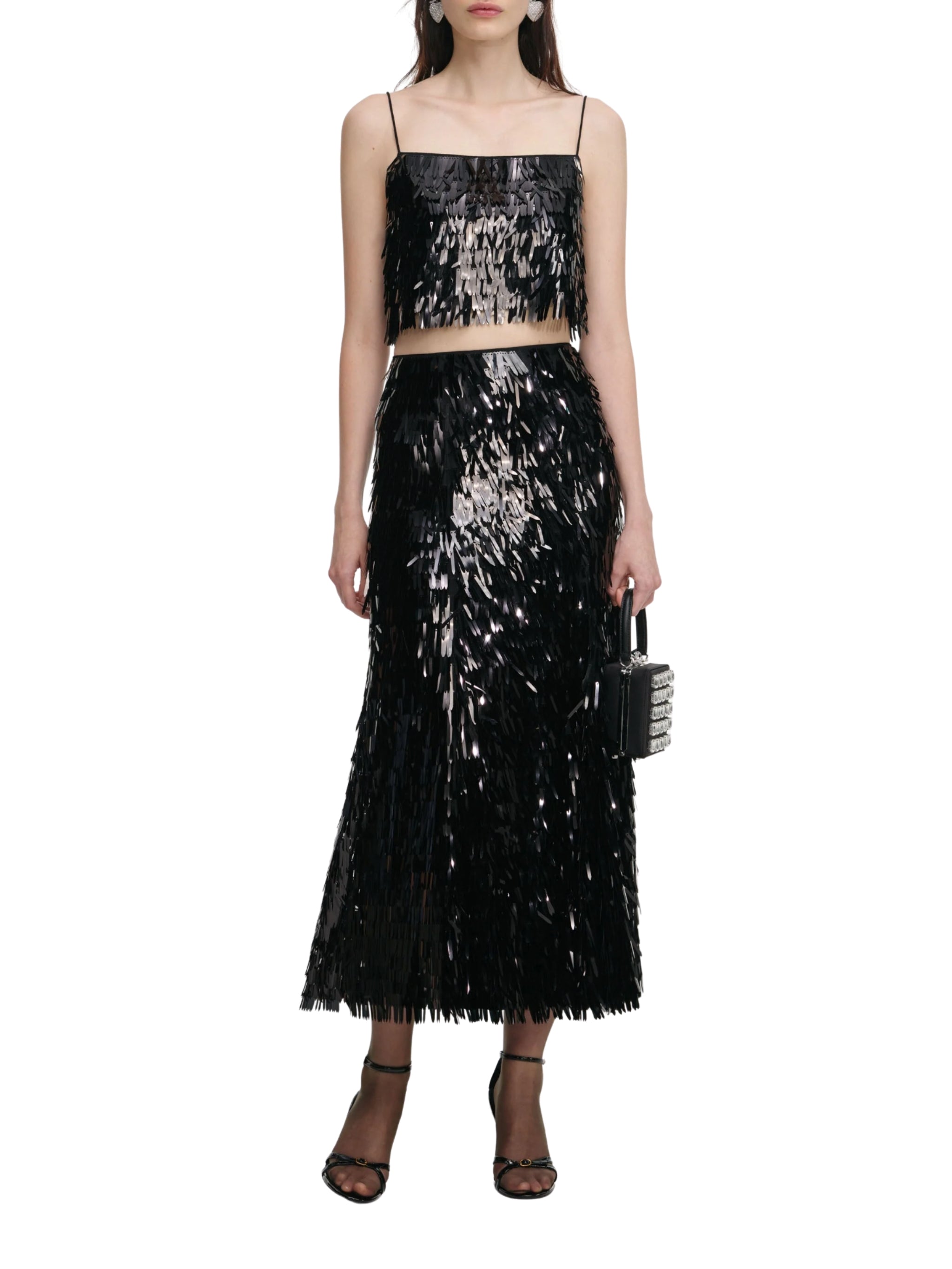 Turn heads with this black sequin top by SELF PORTRAIT. Feather-like long sequins add dynamic texture to a statement cropped silhouette, perfect for pairing with high-waisted denim for date nights or with the matching sequin skirt for a show-stopping ensemble.
