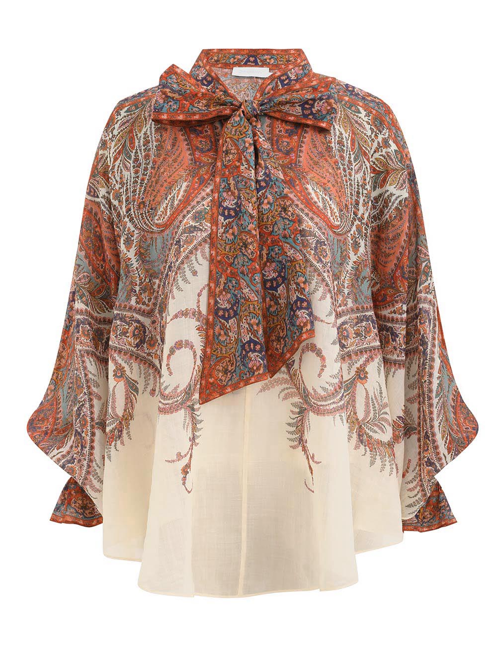 Step into sophistication with the Rhiannon Tie Neck Blouse in Cream Paisley, an exquisite piece from our latest collection. Crafted from 100% ramie fabric, this cape-style blouse is a statement of refined artistry, featuring a soft, flowy silhouette that enhances its airy, lightweight feel.