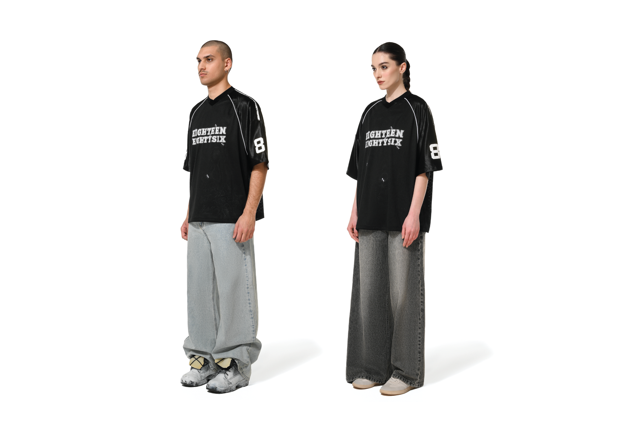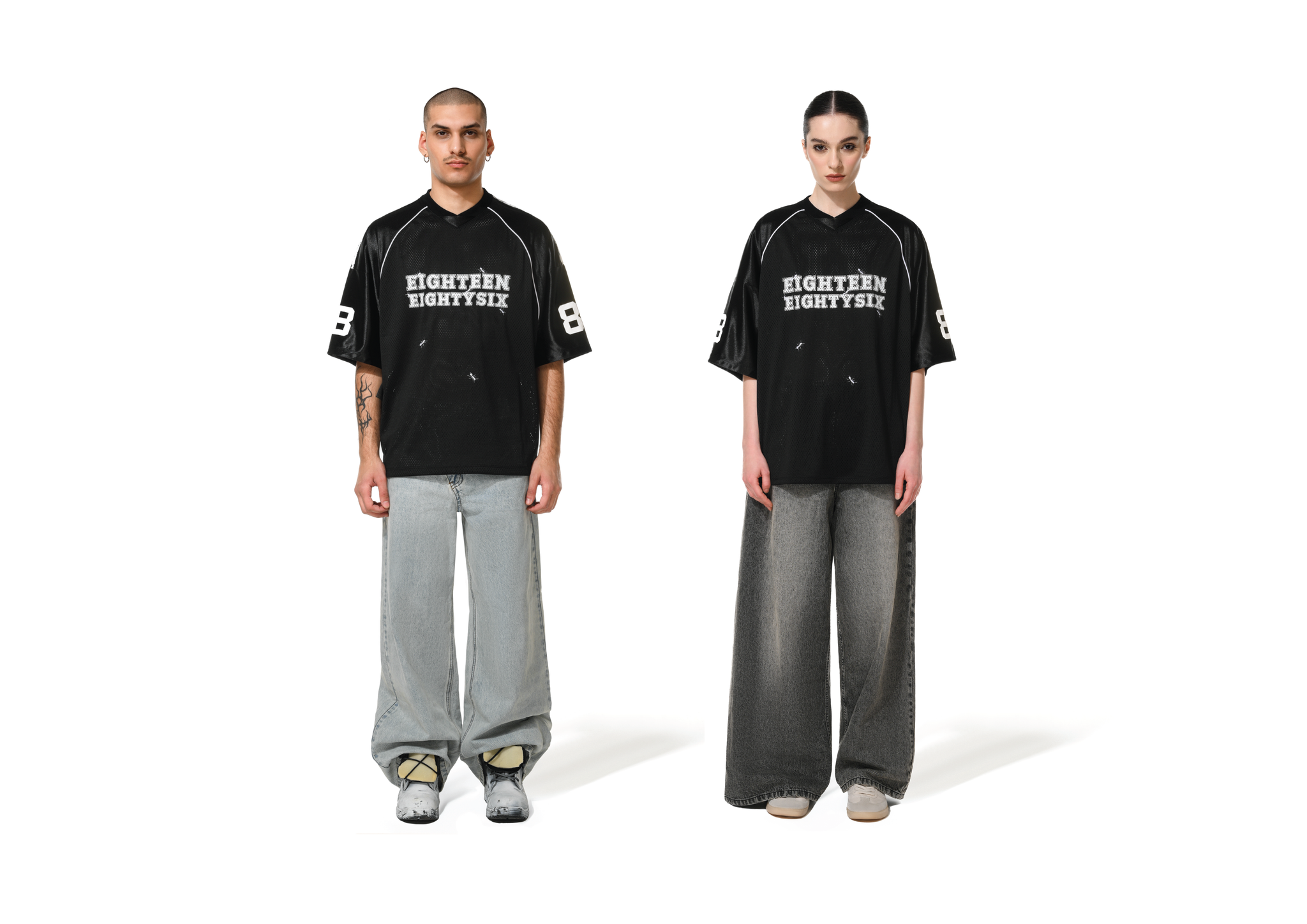 Elevate your casual look with our oversized jersey, designed to blend comfort with urban flair. Featuring the bold "Eighteen Eighty Six" logo on the front and unique graphic prints on the sleeves and back, this piece delivers standout style with a relaxed fit—perfect for laid-back, fashion-forward dressing.