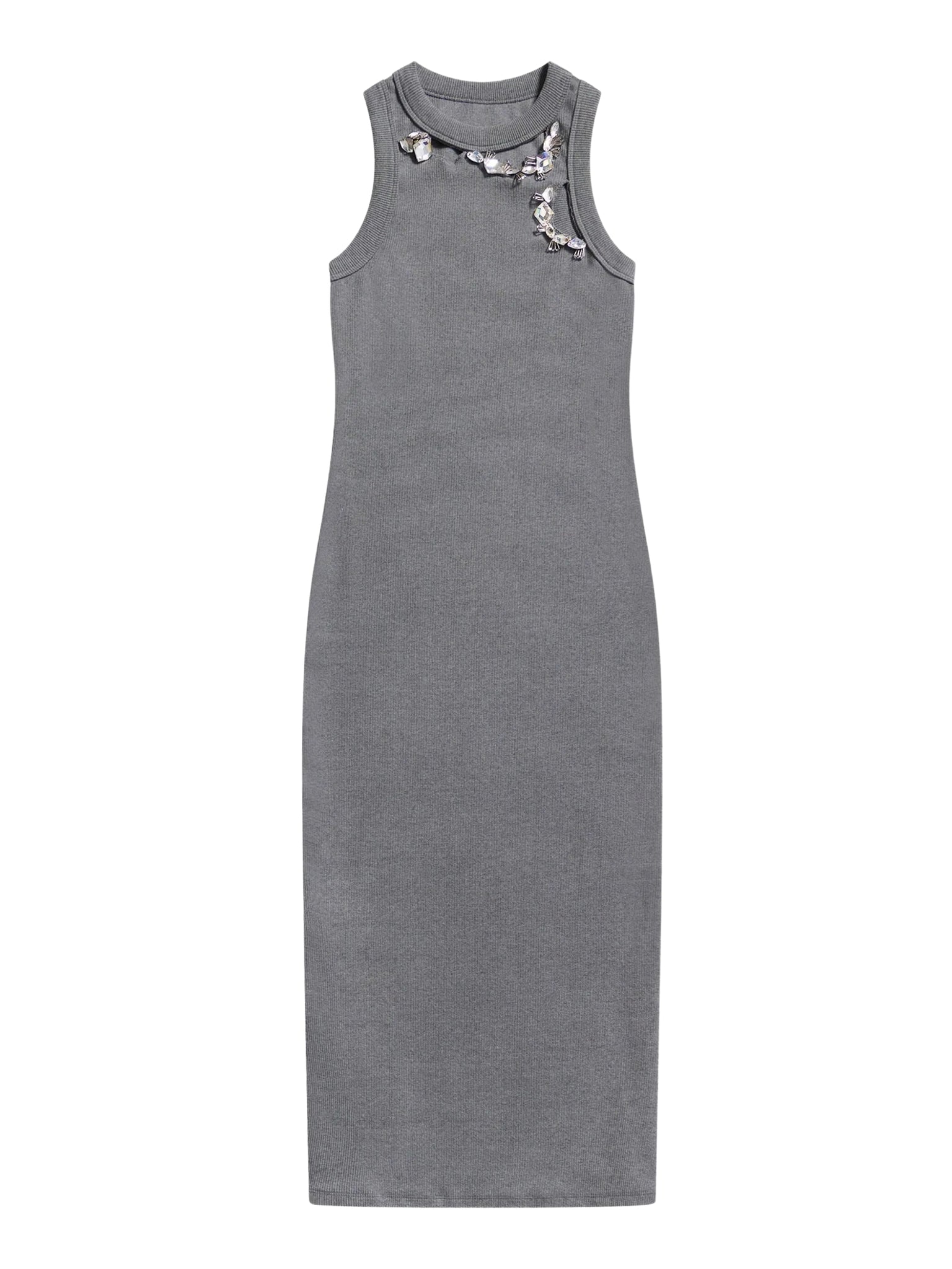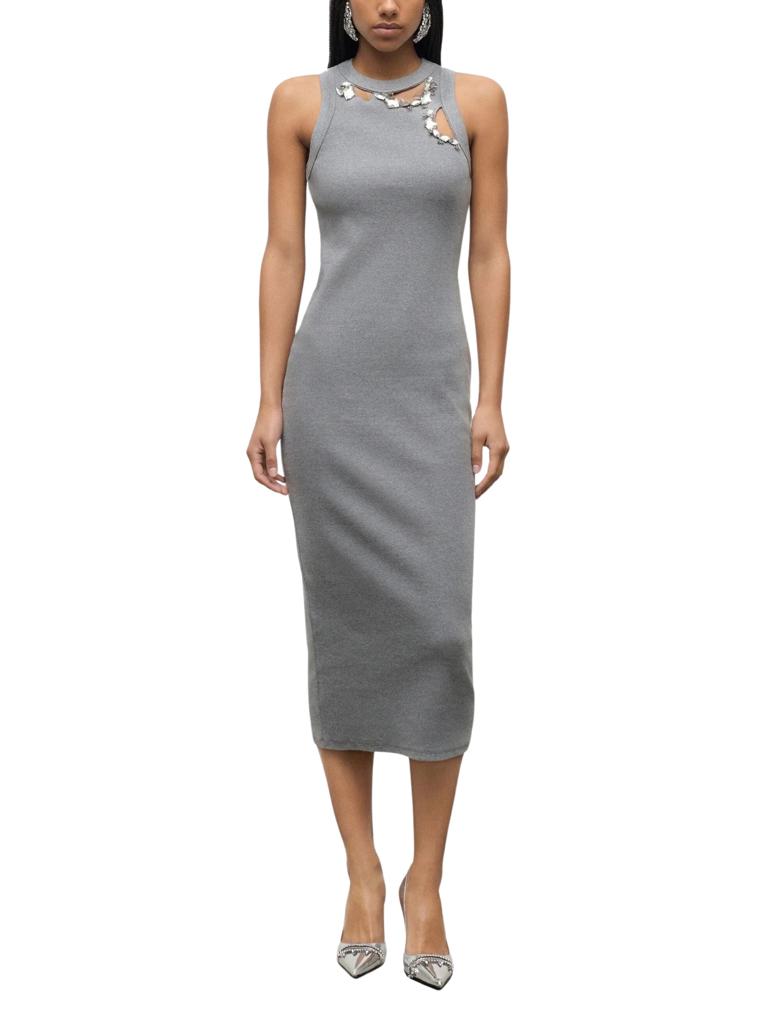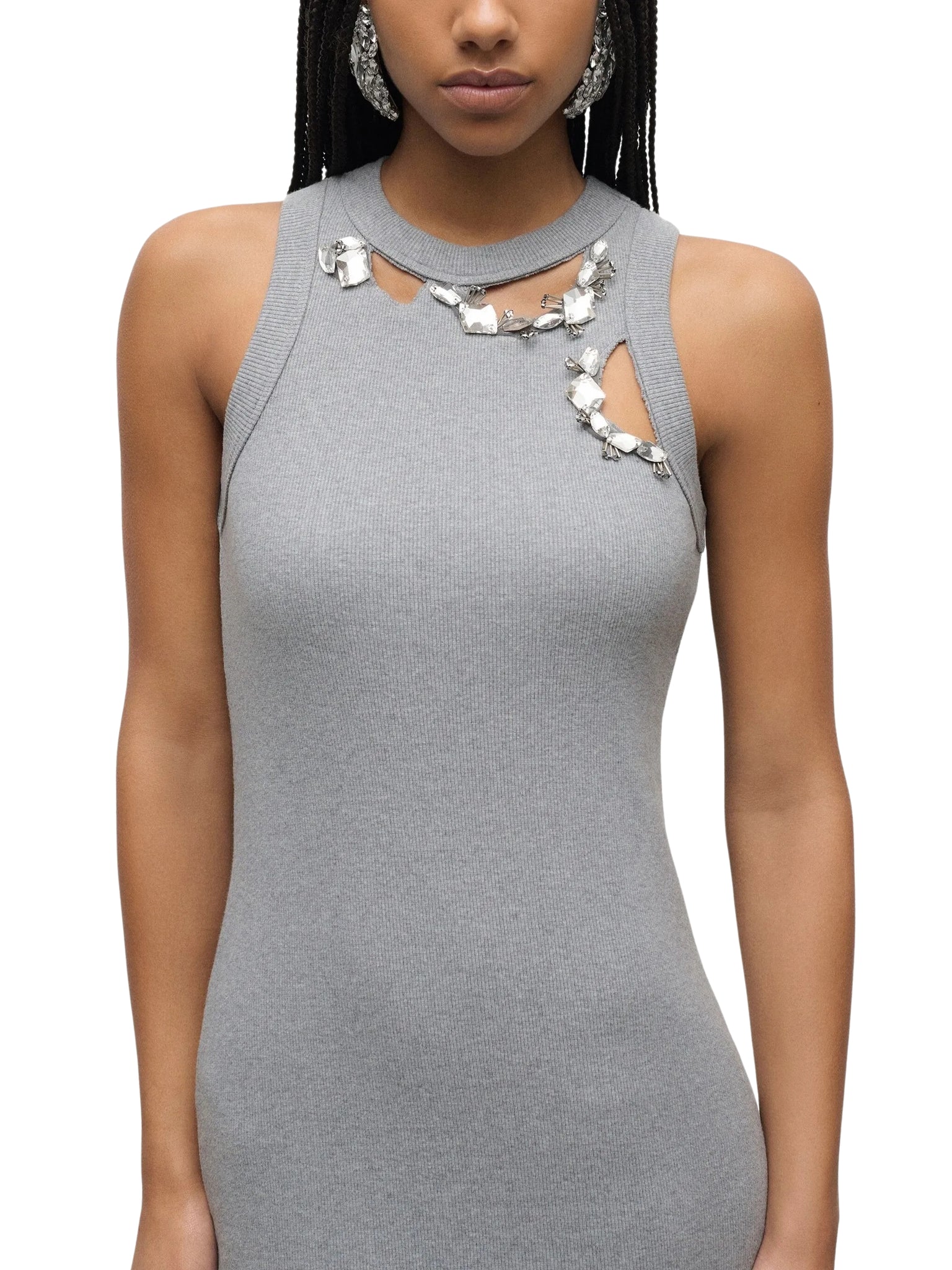 Make a statement with the Distressed Crystal Ribbed Knit Midi Tank Dress by AREA. This high-fashion piece blends edgy distressed details with sparkling crystal embellishments, delivering bold, runway-inspired glamour perfect for luxury events and upscale nightlife in Saudi Arabia.