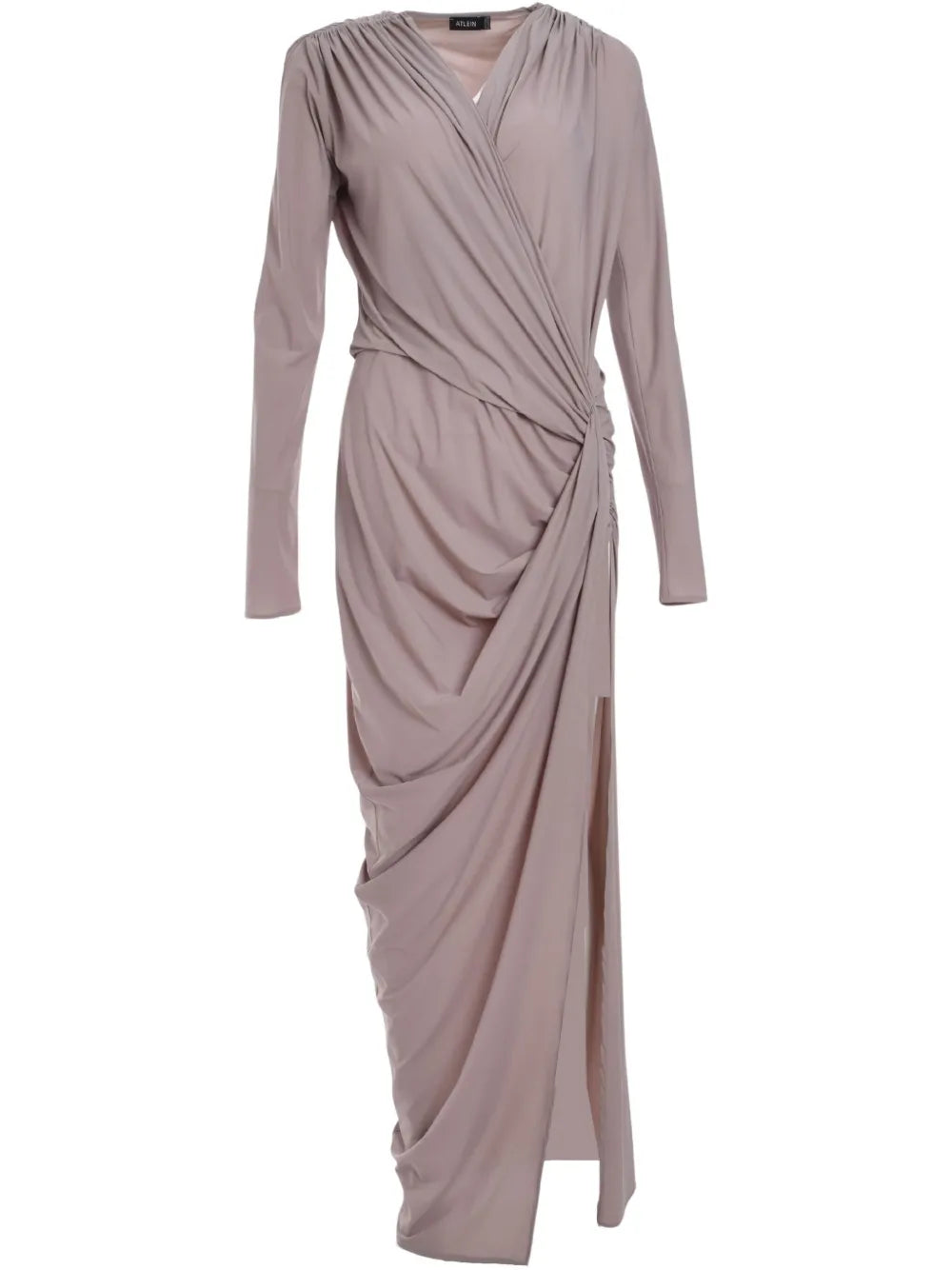 A graceful expression of modern femininity, this Atlein maxi dress features a flowing silhouette and elegant draped details. Crafted in France from luxurious viscose, the design showcases a flattering V-neckline, long sleeves, and a cinched waist that defines the figure. The side slit adds a contemporary touch, perfect for elevated day-to-evening dressing.