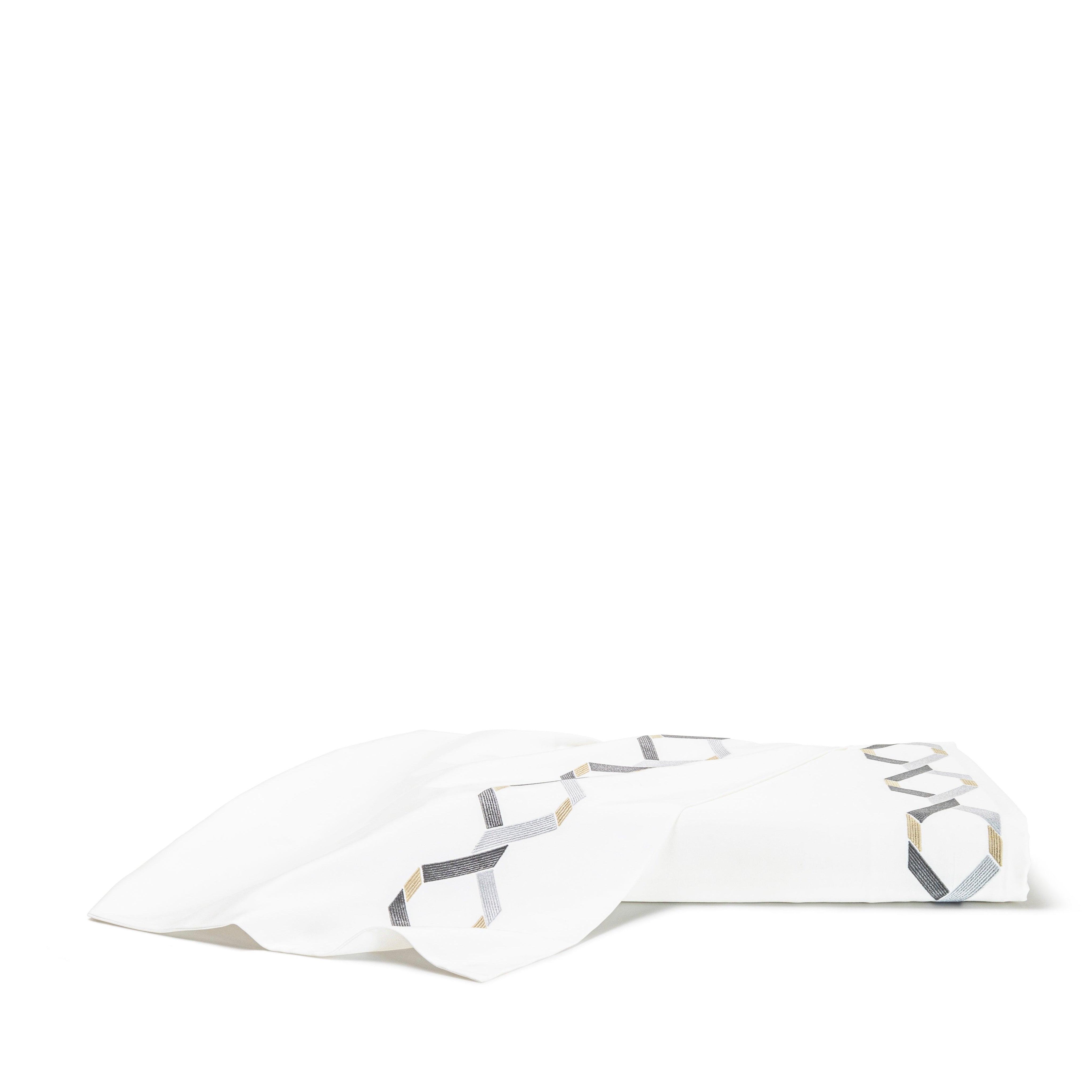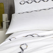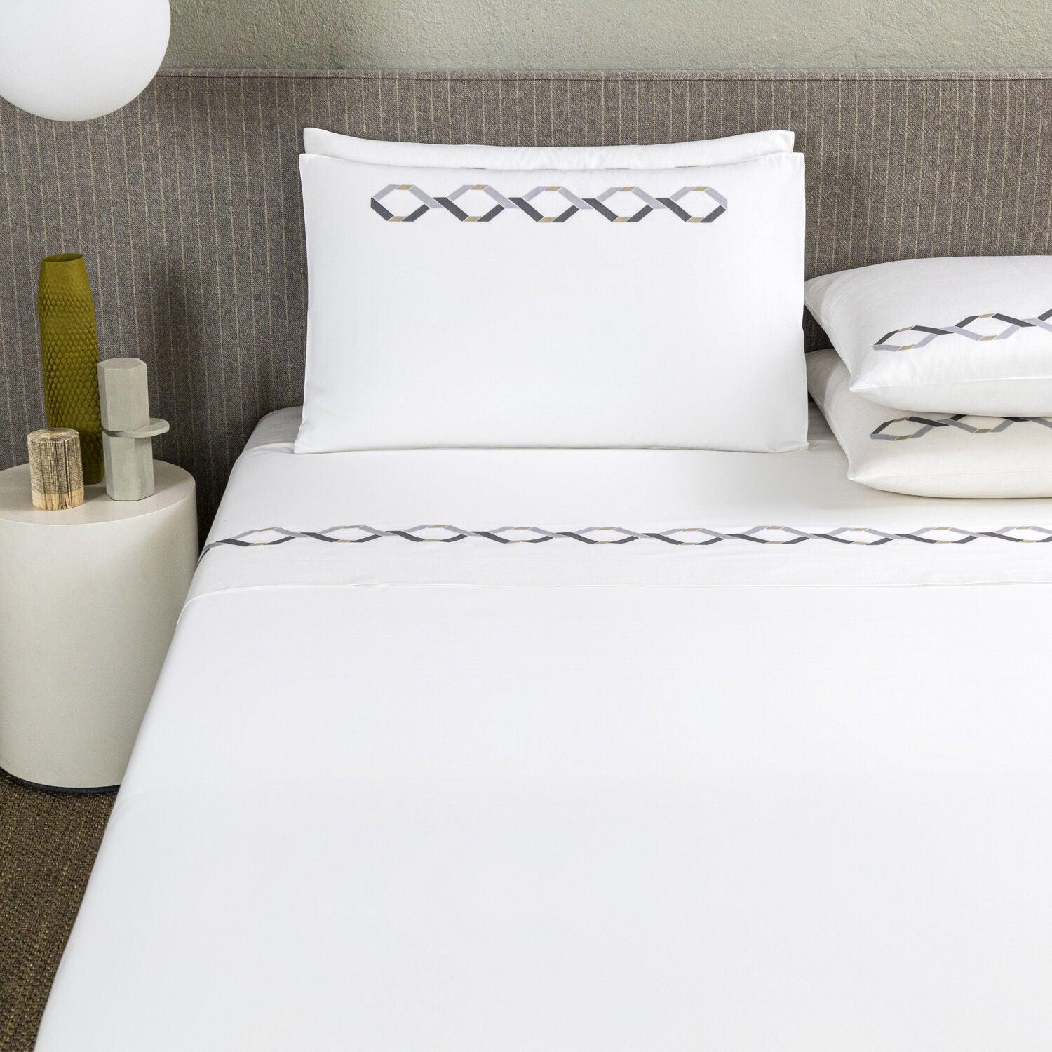 Sheet in solid cotton sateen with embroidery. Shams with embroidery on front. Simple hem finishing. Bottom sheet in matching cotton sateen.,100% Cotton