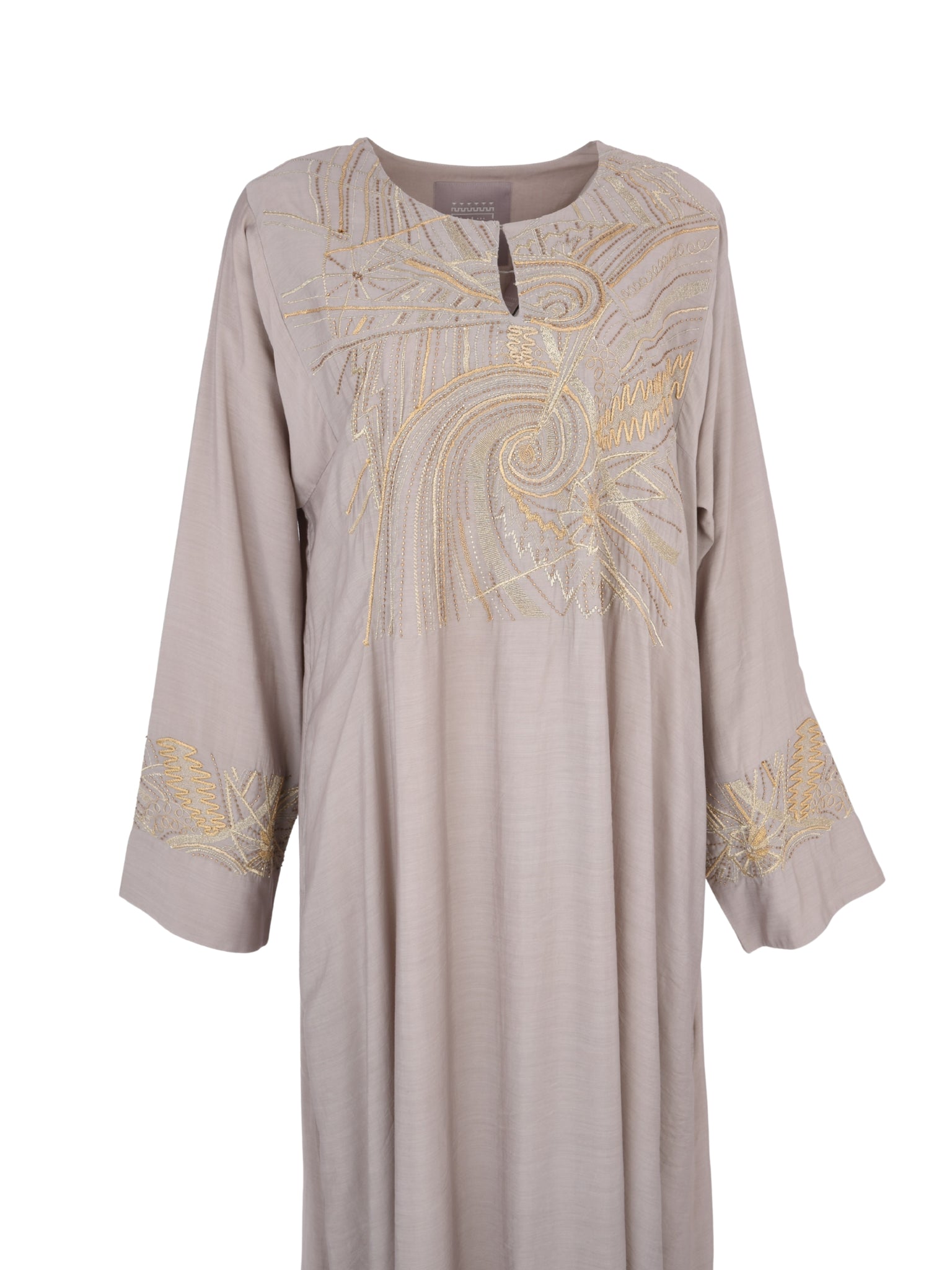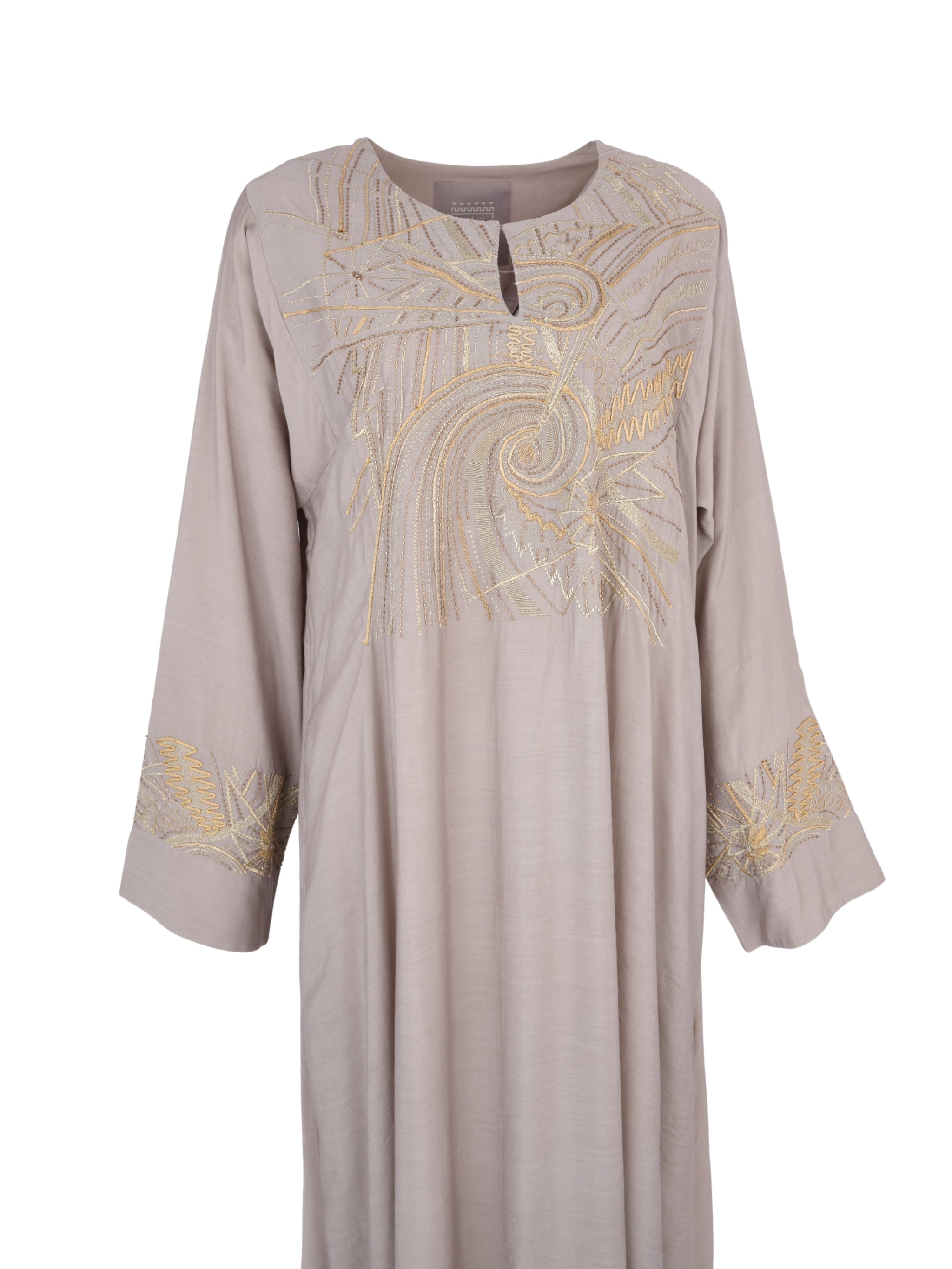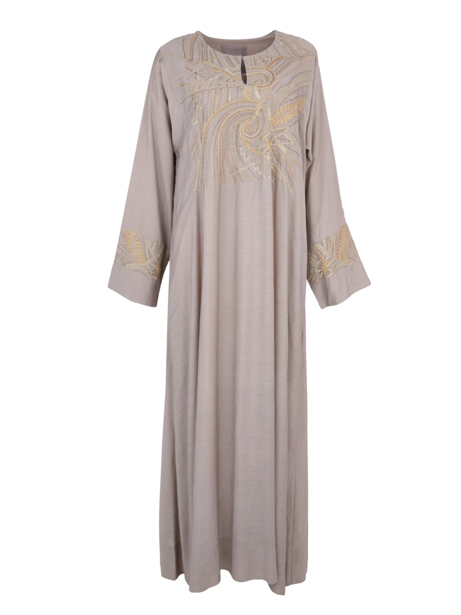 An elegant A-line cotton-silk design by MESHAEL ALTORATH, crafted to reflect effortless sophistication. The soft beige tone and flowing silhouette create a timeless piece that embodies contemporary Saudi luxury with refined simplicity.