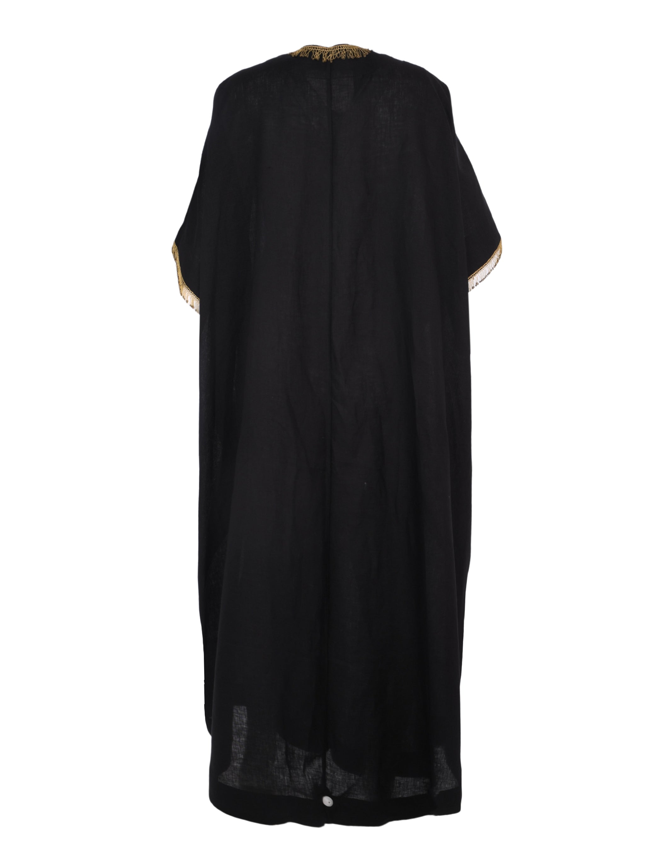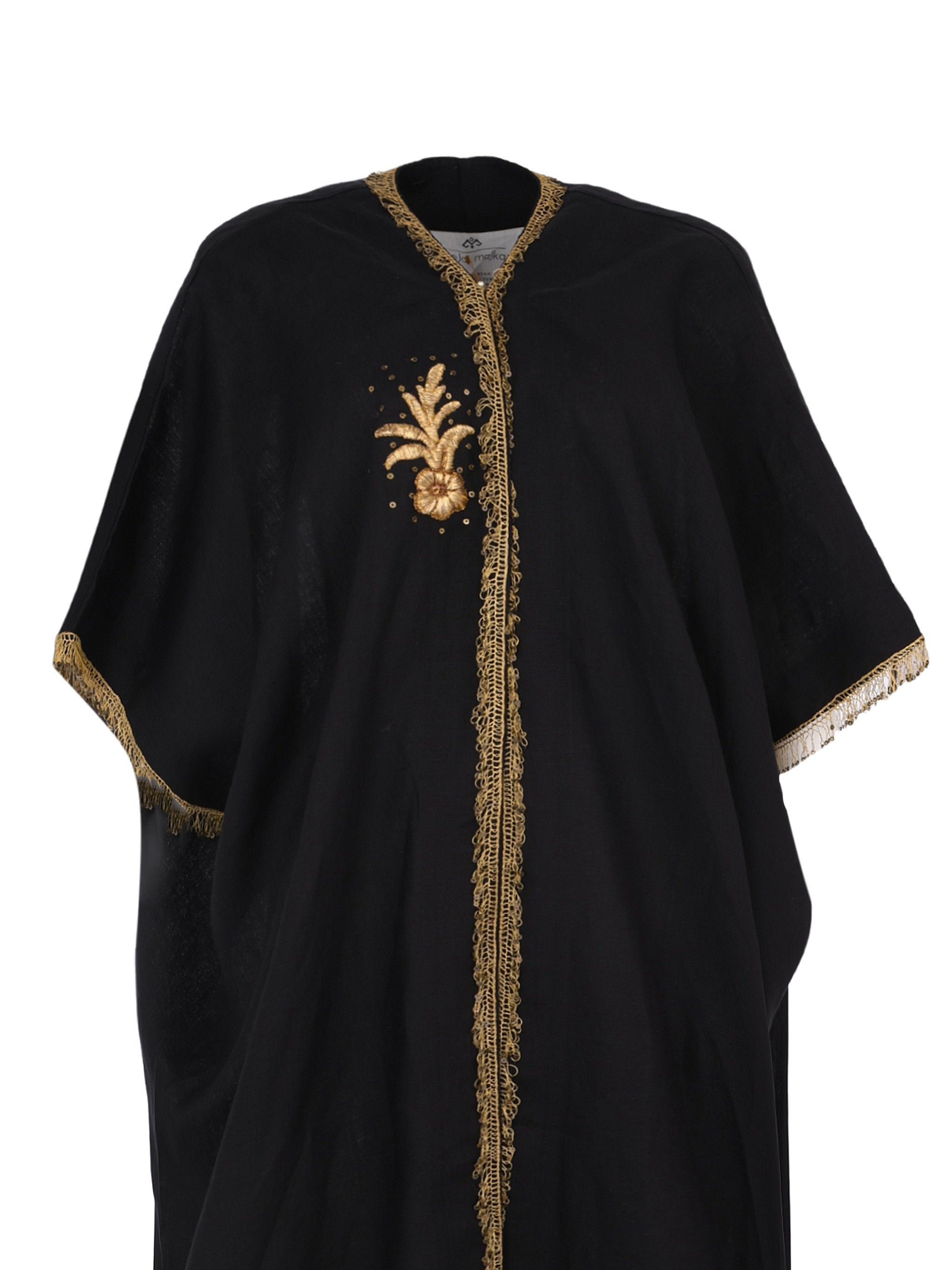 A refined black Sirma bisht by Moja Majka, designed to embody timeless elegance with a modern edge. Its structured silhouette and sleek tone reflect contemporary Saudi luxury with effortless sophistication.