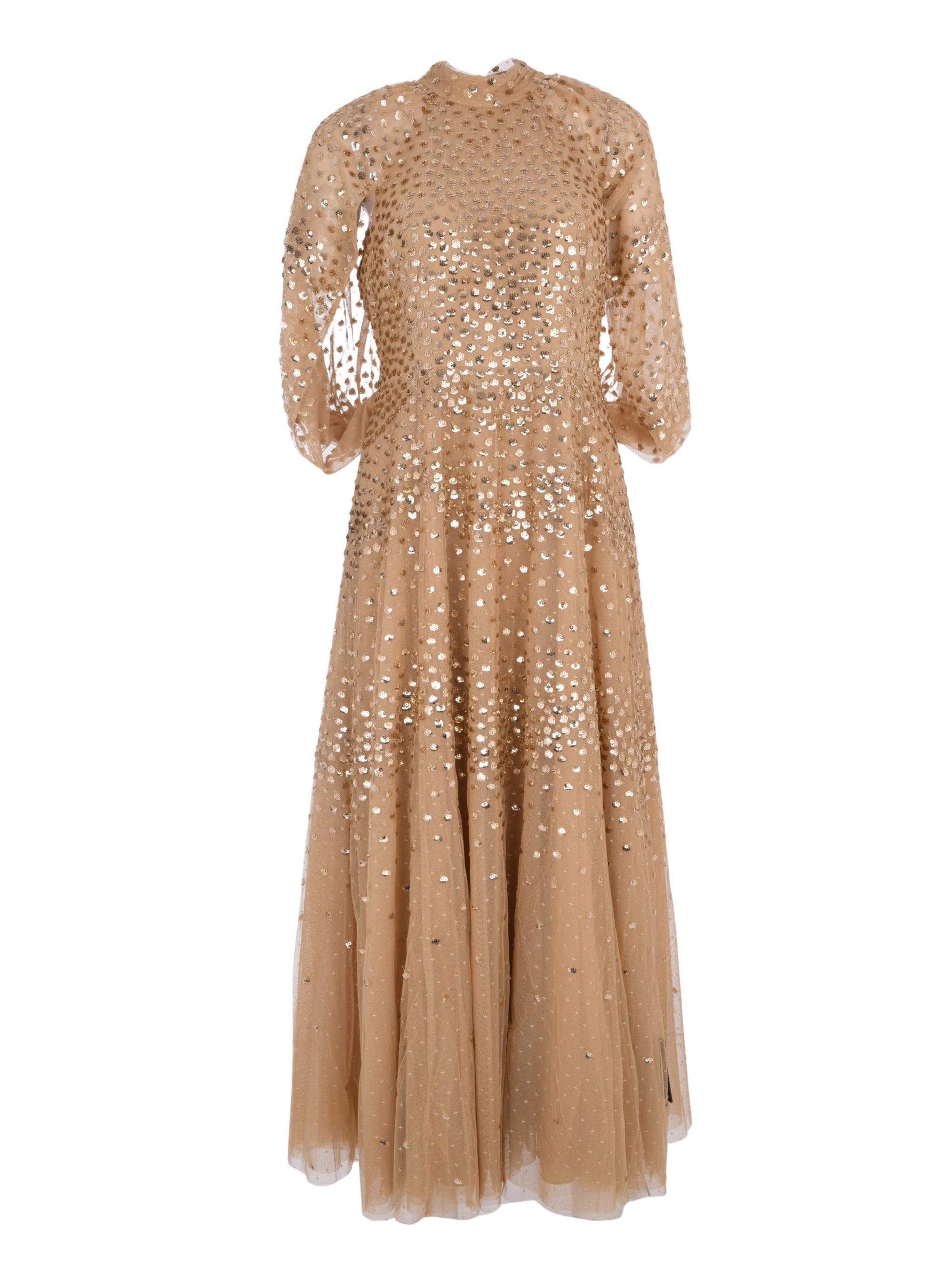 Rich in tone and shimmer, the Scallop Sequin Cape Ankle Gown by NEEDLE & THREAD in brown delivers refined glamour with an elegant cape silhouette, ideal for evening occasions in Saudi Arabia.
