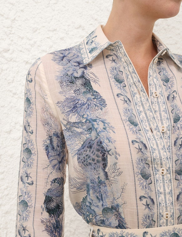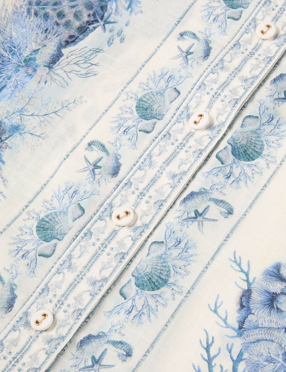 From the Resort Swim 2026 Collection, the Wanderlust Body Shirt in Blue Toile combines timeless tailoring with refined resort elegance. Crafted from 100% cotton, this fitted shirt features a classic collar, long sleeves with buttoned cuffs, and functional buttons down the centre front. Perfect for elevated daytime styling, beachside lunches, or chic casual looks in Saudi Arabia, it pairs beautifully with skirts, tailored trousers, or designer shorts for a sophisticated resort-ready wardrobe.