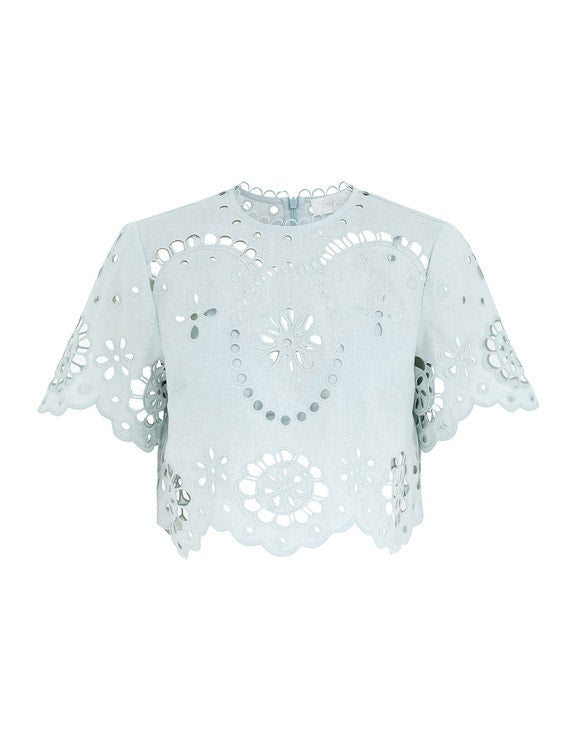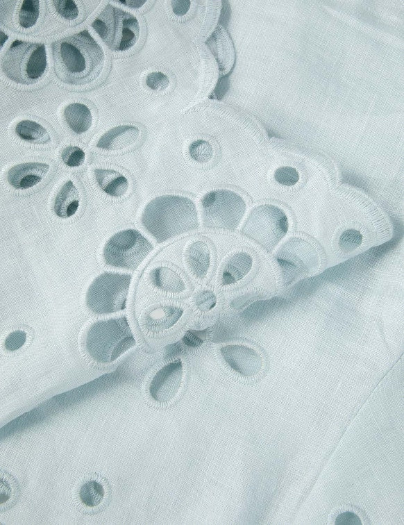 From the Resort Swim 2026 Collection, the Awaken Embroidered Bodice in Mint combines delicate craftsmanship with breezy resort style. Crafted from 100% linen, this cropped top features short sleeves with wide cuffs, scalloped trims, and an invisible centre back zip. The intricate embroidery and separate bralette add a touch of refined elegance, making it perfect for elevated summer styling, beachside gatherings, or casual luxury outfits in Saudi Arabia.