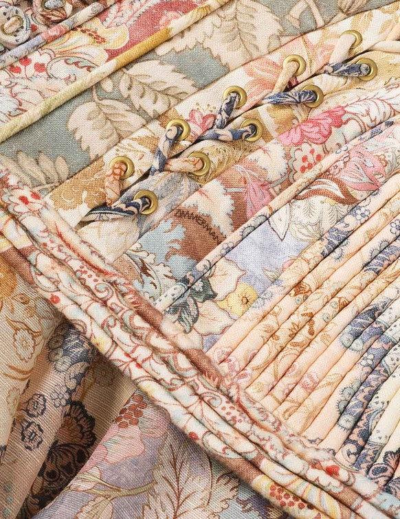 From the Cruise 2026 Twisted Romance collection, the Rebellion Corded Maxi Dress in Spliced Floral blends structured elegance with romantic detailing. Crafted from premium linen with silk accents, this maxi dress features a plunging V-neckline, elongated corset bodice with boning and underwire, and a pleated skirt for graceful movement. Perfect for Ramadan evenings, Eid celebrations, or formal gatherings in Saudi Arabia, it embodies refined luxury and signature Zimmermann craftsmanship.